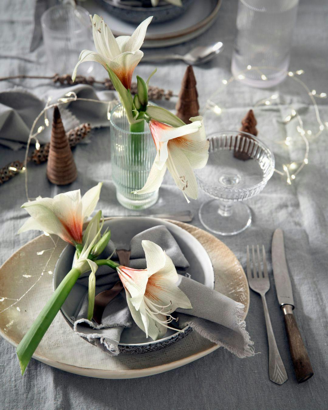 Amaryllis både dufter skønt og er overdådig smuk i vaser. Du kan også bruge dem som bordpynt ved blot at skære stænglerne korte og lægge en enkelt på hver tallerken. Blomsterne kan sagtens ligge og pynte i op til en halv dag uden vand, da stænglerne er gode til at holde på væsken. Vil du spare på blomsterne, kan du nøjes med at bruge et enkelt blomsterhoved pr. tallerken i stedet for en stængel med flere blomster.