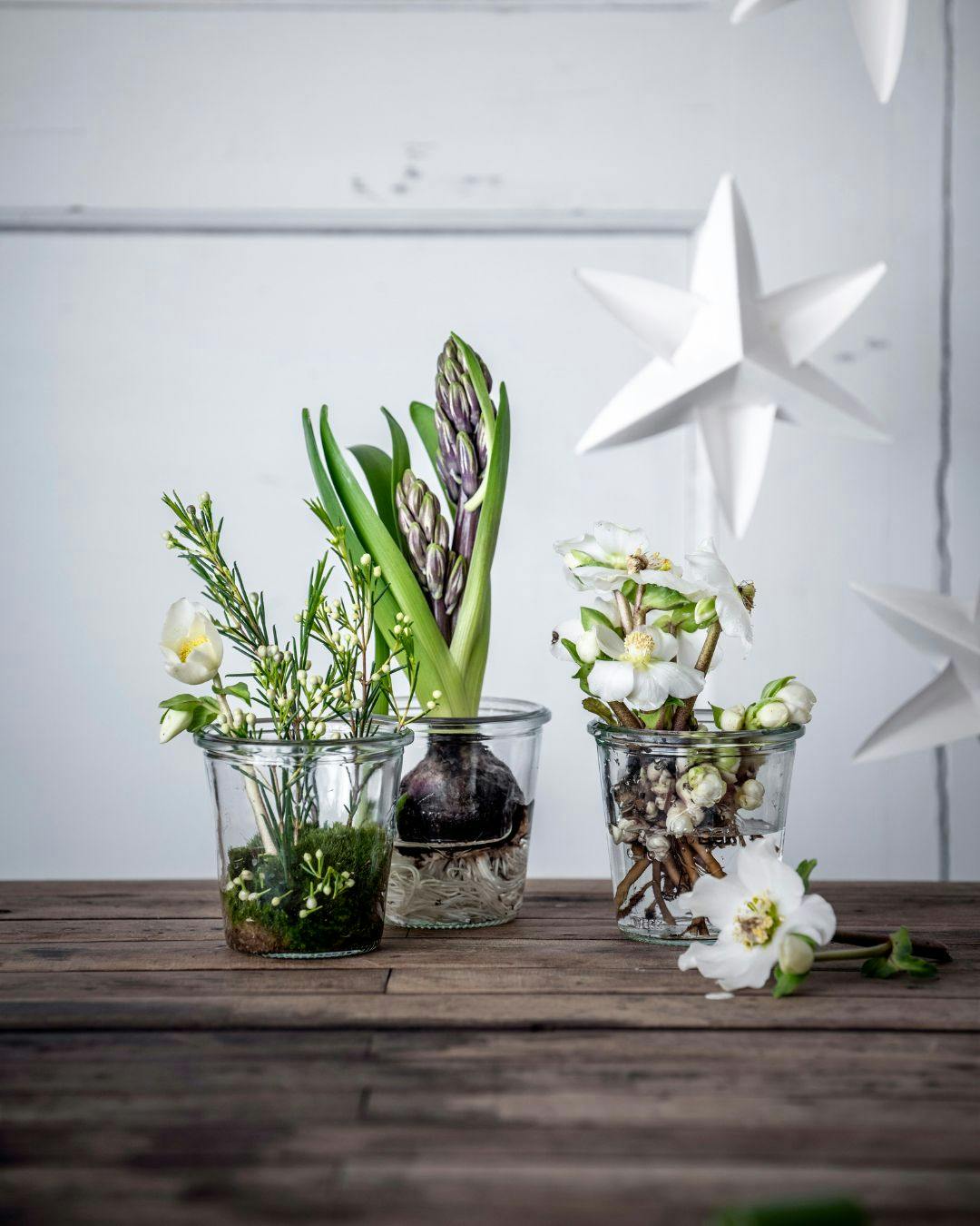 Tag et stykke af haven med indenfor, og lad det pryde nogle glas. Læg et stykke mos i bunden af et glas, og placér små grene og blomsterstilke ovenpå. Sørg for, at mosset er godt gennemvædet. Kom vand i to andre glas, og pynt dem med hyacintløg og juleroser, der er skyllet fri for jord. De synlige rødder er nemlig også dekorative. Husk, at hyacintløget ikke må stå i for meget vand, for så rådner det.