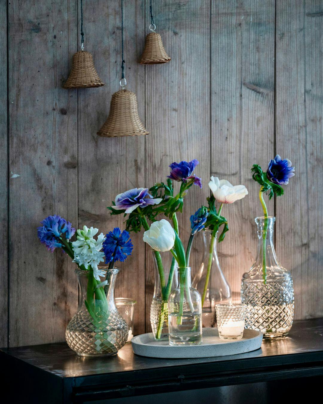 Lav et fint stilleben med vaser, karafler og små glasflasker, som du fylder med en blanding af forskellige hvide og lilla blomster. Vi har brugt afskårne hyacinter, franske anemoner og juletulipaner. Hvis du stiller små fyrfadsstager blandt vaserne, giver det en flot effekt med lyset i glasset.