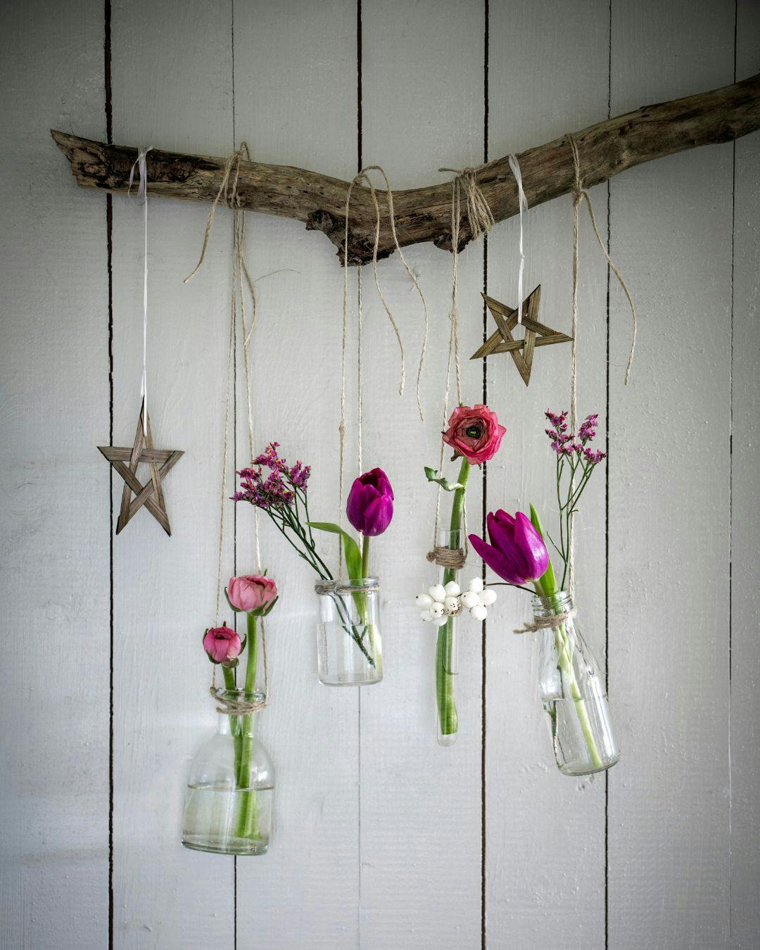 Blomster behøver ikke kun at pynte på bordet. Find en flot, tyk gren i naturen, og hæng den op under loftet. Hæng små syltetøjsglas og flasker på grenen med snor. Fyld dem med enkelte stilke af f.eks. ranunkel, hindebæger og tulipan samt grene med snebær. Så har du skabt en lille, julet blomstervæg.