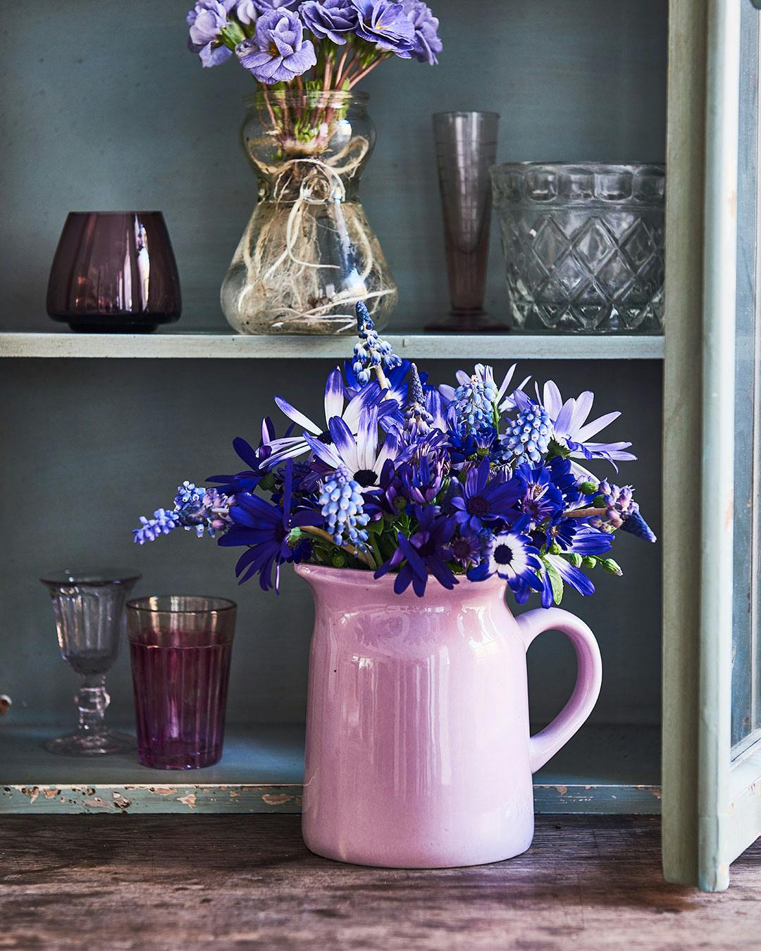 Cinerarie, Pericallis ’Senetii’, er en udendørsplante, som giver mange blomster og fås i flere nuancer. Her har vi lavet en lille, tæt buket med den mørklilla tone og den tofarvede i hvid og lilla. For at give buketten ekstra liv har vi tilført perlehyacinter. På hylden bagved har vi anrettet primulaer i en vase med vand. Rødderne er skyllet fri for jord, og bladene er nippet af.