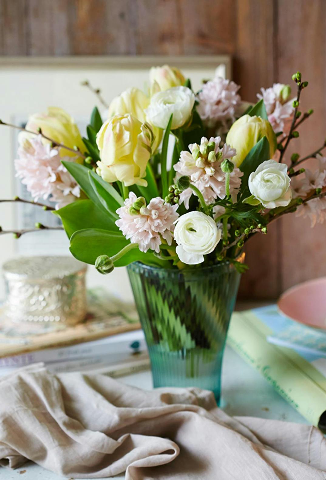 Hvis du vil købe snitblomster hos blomsterhandleren, er det årstid for tulipaner, franske anemoner, gæslinge - og kirsebærgrene og ikke mindst hyacinter. Sidstnævnte er med til at give en liflig duft i hjemmet. Du kan være heldig at finde bundter af tulipaner med dobbelte, let krøllede eller frynsede blomsterblade samt to farvede, der skaber ekstra liv i en buket. Mix gerne blomsterne med grene fra haven for et mere personligt og vildt udtryk.