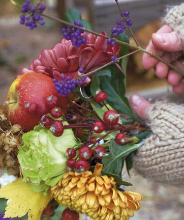• Sæt æblet på en træpind, og lad det indgå i buketten.