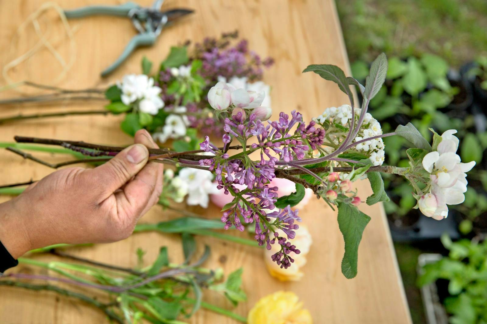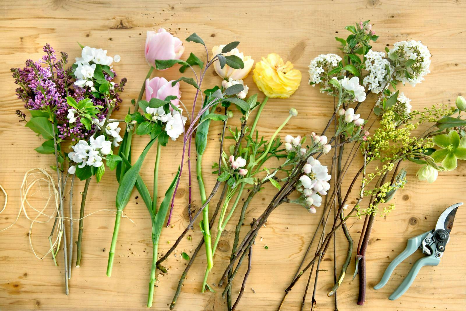 • Lilla syrener • Blomstrende æblegrene • 2-3 lyserøde tulipaner • 1 gul ranunkel • Salvie • Hvid duftsnebolle • 1 ribsbuskgren med grønne blomster • 1 limefarvet påskeklokke • Bastsnor