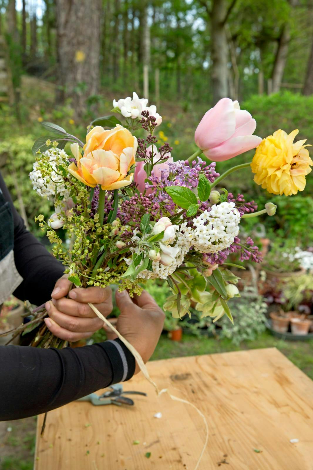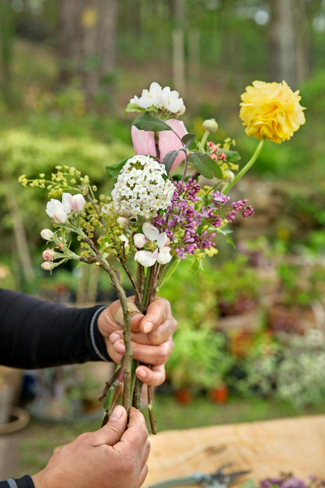 TRIN 2: Læg et par blomster i hånden med stilkene over kors. Hold buketten i venstre hånd, og læg nye blomster på med højre hånd, imens buketten hele tiden drejes lidt rundt, så du ser den fra alle vinkler, og så der kan findes en passende plads til en ny blomst.