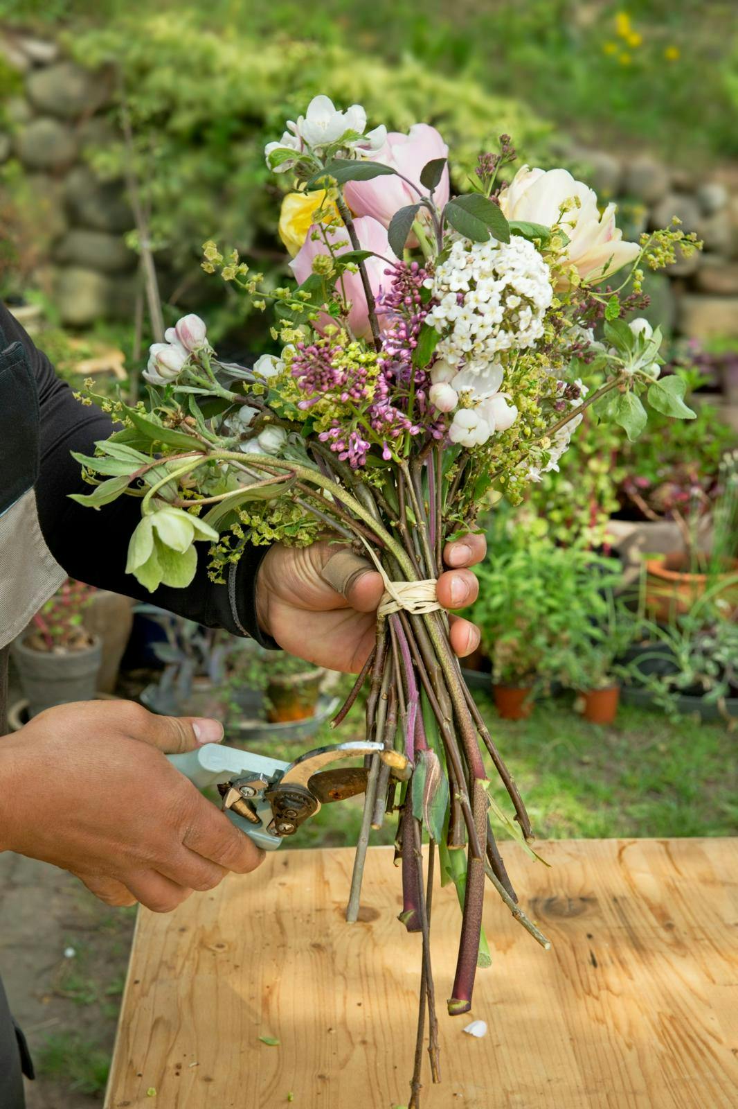 TRIN 5: Klip enderne til, så de er lige lange. Giv altid stilkene et langt skråsnit, så sugefladen bliver størst muligt. Eneste undtagelse er alle løgblomster, som skal klippes lige af, for at de ikke udvikler sig for hurtigt. Sæt buketten i en vase med vand.