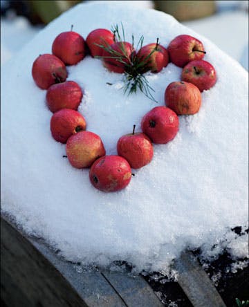 De smukke røde pigeonæbler hører julen til. Tidligere blev æblerne pudset og poleret og brugt som pynt på juletræet, i dag bruger vi dem typisk som pynt i dekorationer, både inde og ude, som mad til fuglene, men også som en lækkerbid til os selv, da æblerne har en helt speciel smag og sødme.