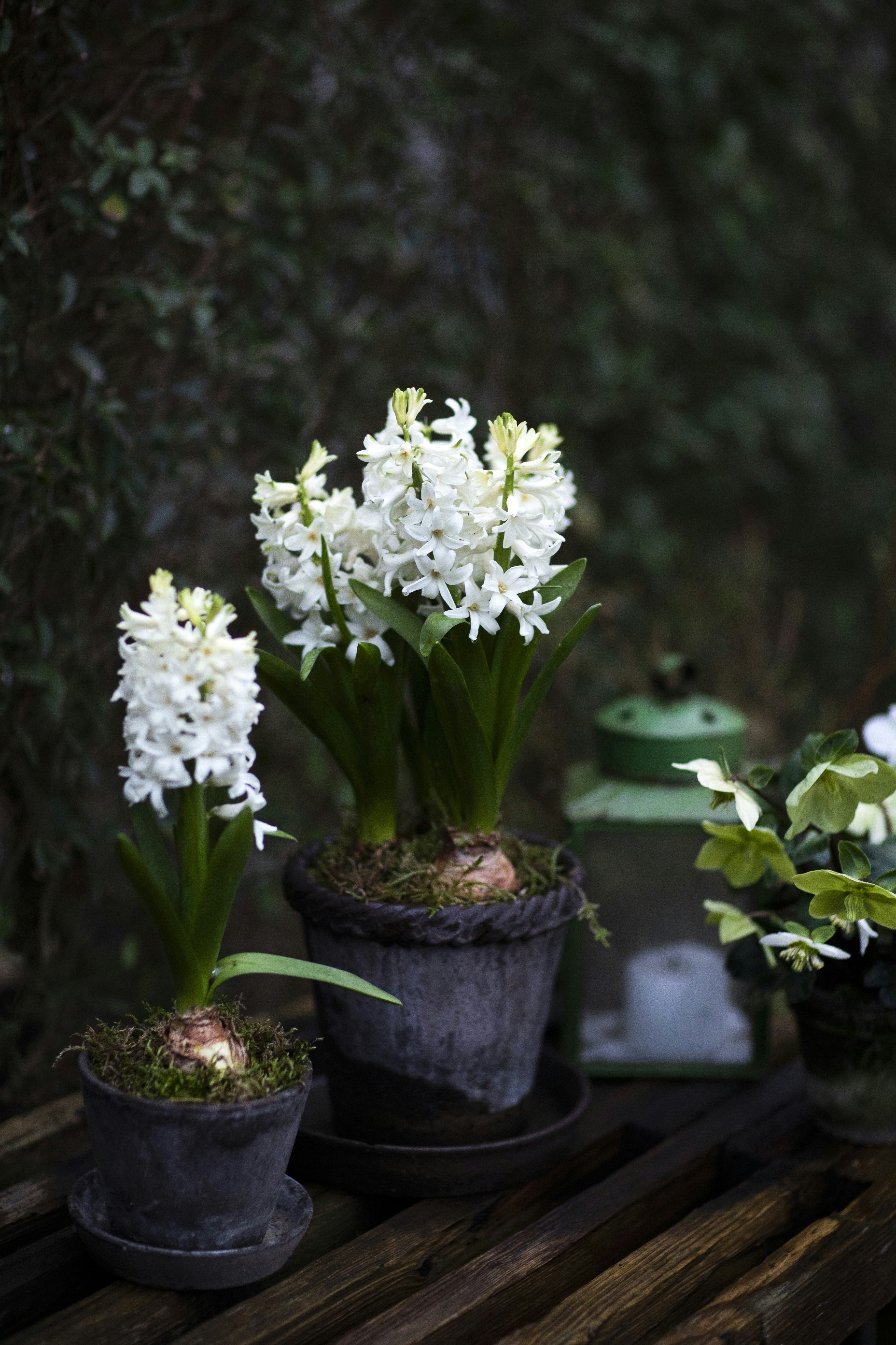 Hyacinter har deres naturlige blomstring i haven i løbet af foråret, men hvis du køber planter og sætter dem i potter og dækker jorden med blødt mos, kan du nyde dem allerede ved juletid. Det forudsætter dog, at vinteren er mild, for de blomstrende hyacinter tåler ikke frost. Sæt gerne flere potter sammen i en gruppe, f.eks. sammen med en lanterne og en potte med juleroser.