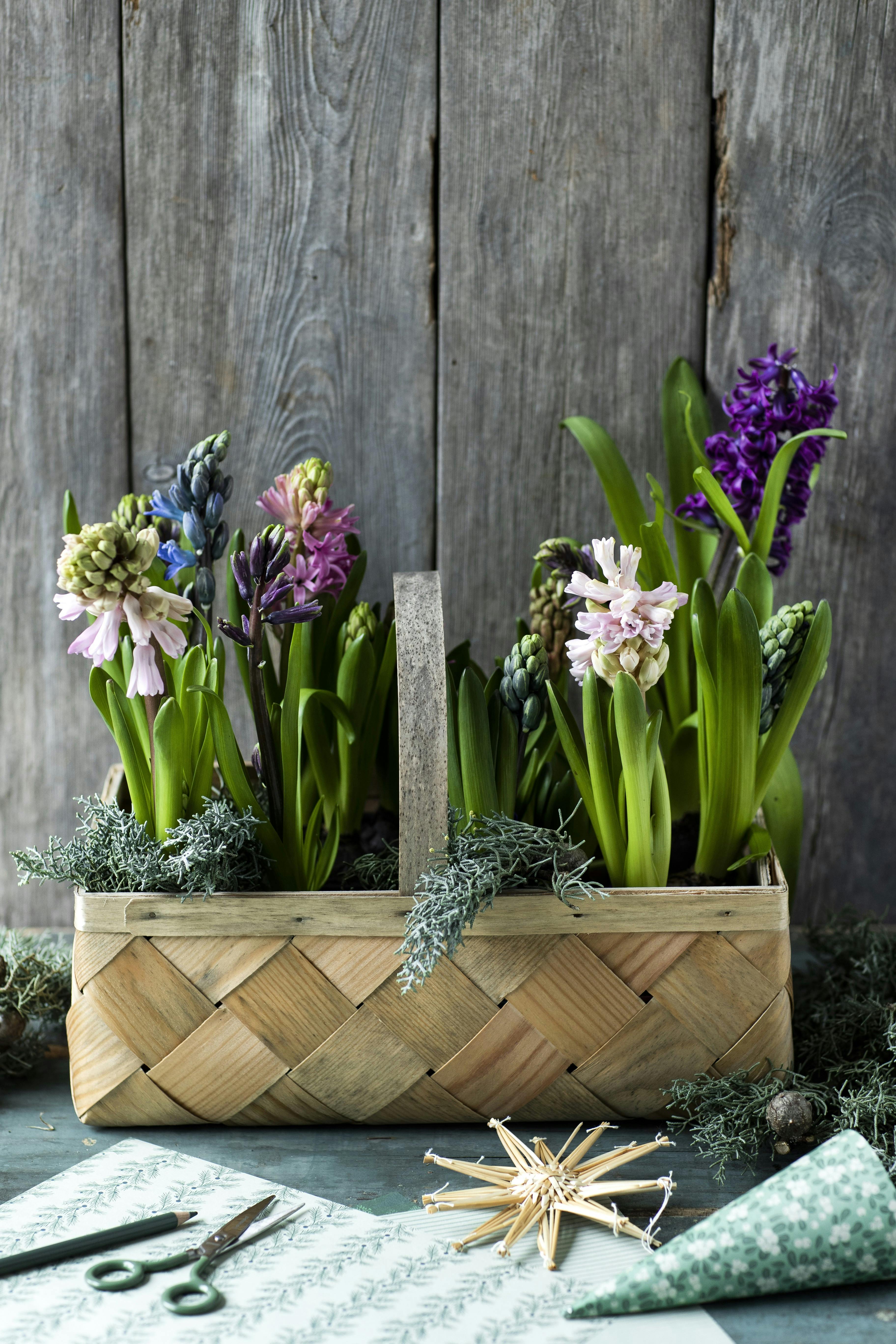 Det behøver ikke at være svært at lave en flot blomsterdekoration. For en kurv med plastik, jord og evt. mos, og plant hyacinter i forskellige farver i den. Sæt gerne nogle kviste arizonacypres imellem løgvæksterne – så har du den skønneste, lille blomsterhave, der emmer af vildskab.