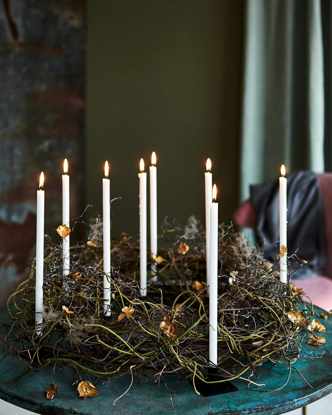 TIP: Alle typer bøjelige grene kan bruges til at lave denne krans. Efter jul kan du fjerne guldranken og eventuelt binde et par friske blomster fra juleroser eller vinterblomstrende buske på. Så kan du have glæde af kransen helt til foråret.