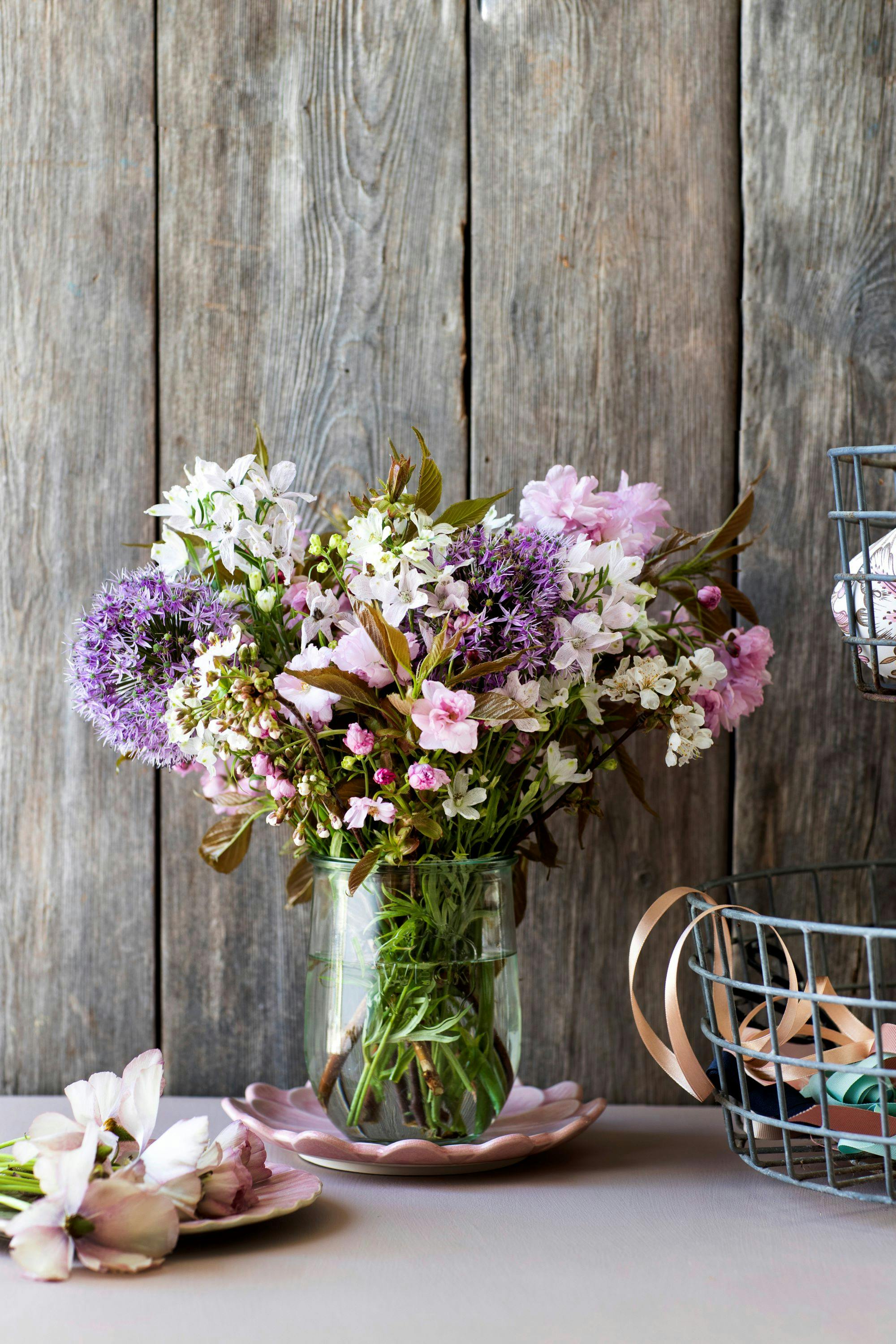 På denne tid af året står mange træer i fuldt flor, ligesom der dukker utallige vidunderlige planter frem fra jorden. Prøv at blande nogle af disse skønne blomster, og supplér eventuelt med lidt fra blomsterhandlerens udvalg. Denne buket er en charmerende blanding af japanske kirsebær, fuglekirsebær, prydløg og haveridderspore.