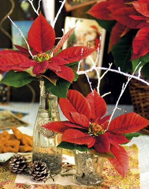 I sæsonen er julestjerner ret rimelig i pris, så klip bare løs af potteplanten. De afskårne grene holder sig fantastisk godt. Her har vi stukket et par grene i gamle mælkeflasker sammen med lidt frostede grene. Julestjernen hedder Euphorbia pulcherrima 'Purple Rain' og har en kraftig blomsterstand i midten. Når du brækker en gren af julestjerneplanten, er det en god idé at brænde enden af stilken let, hvor den hvide mælkesaft vil pible ud.