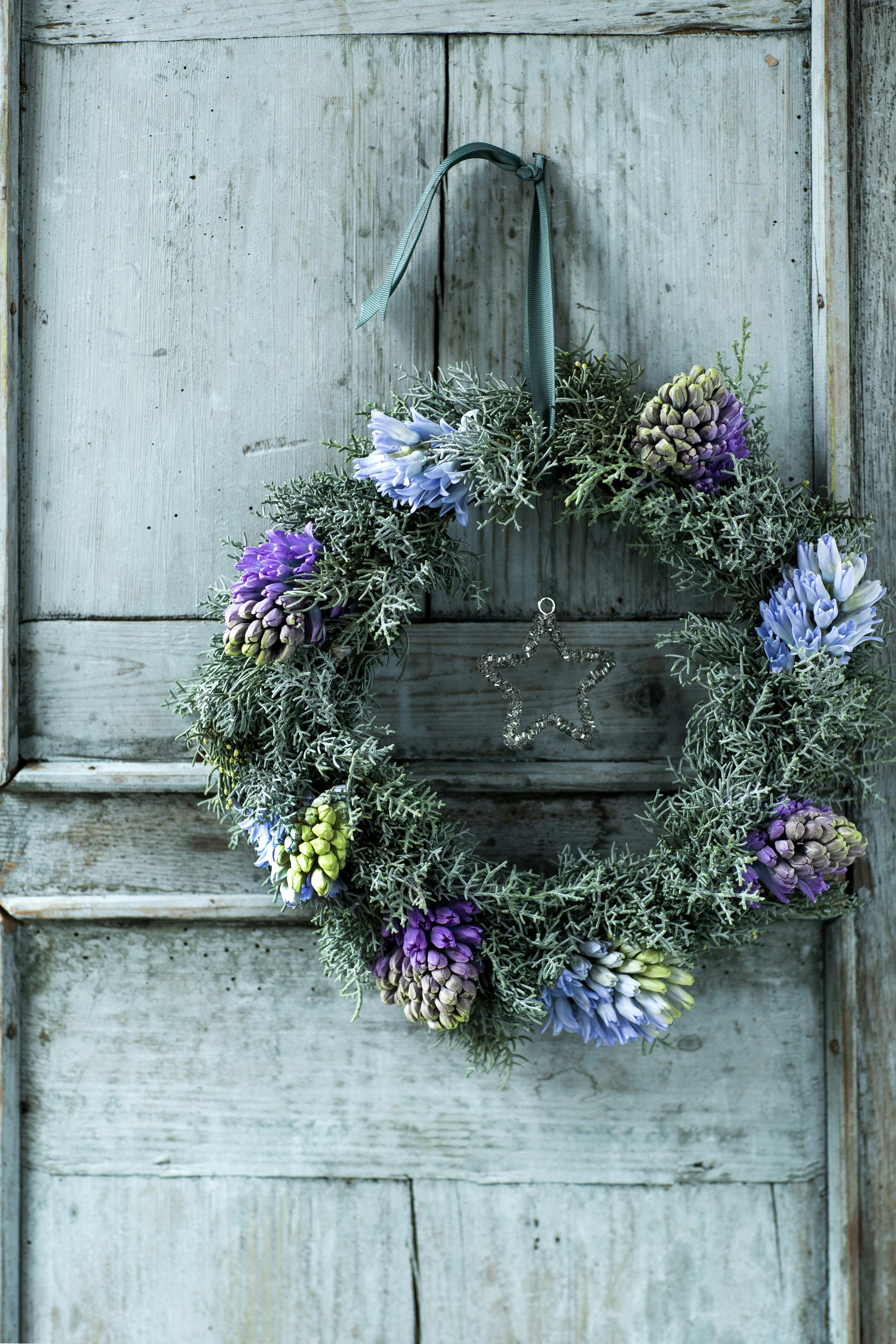 Vinterens mørkegrønne og blå-lilla kølige nuancer gør sig smukt i en dekorativ dørkrans. Hyacinterne kan du selv drive i blomst, og så kan løget genbruges til blomster i foråret! Se, hvordan du binder kransen her.