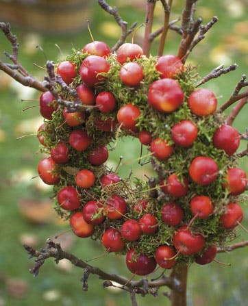 • Fordel æblerne, så mosset titter frem mellem de røde æbler. Inden døre kan kransen holde i en til to uger. Udenfor kan den holde i flere måneder.