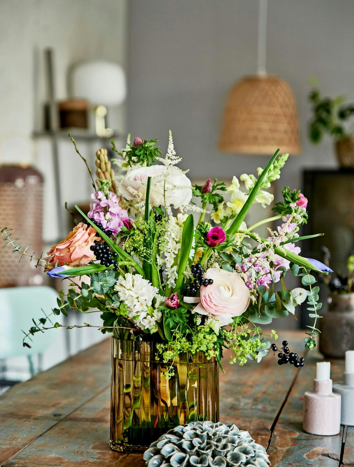 Klip blomster, bær og grene til, og fjern de nederste blade på det stykke af stilkene, der vil blive dækket af vand i vasen. Saml herefter alle dine materialer i en løs buket. Husk at vende og dreje buketten undervejs, mens du samler den, så du er sikker på, at den ser fin ud fra alle sider. Er du ny i blomsterbinding, kan du i stedet lægge et stykke oasis i bunden af din vase og stikke grene og blomster med hårde stilke i 1 ad gangen. Sæt herefter forsigtigt blomsterne med bløde stilke imellem de andre. Sørg for, at alle blomsterne i vasen får vand.