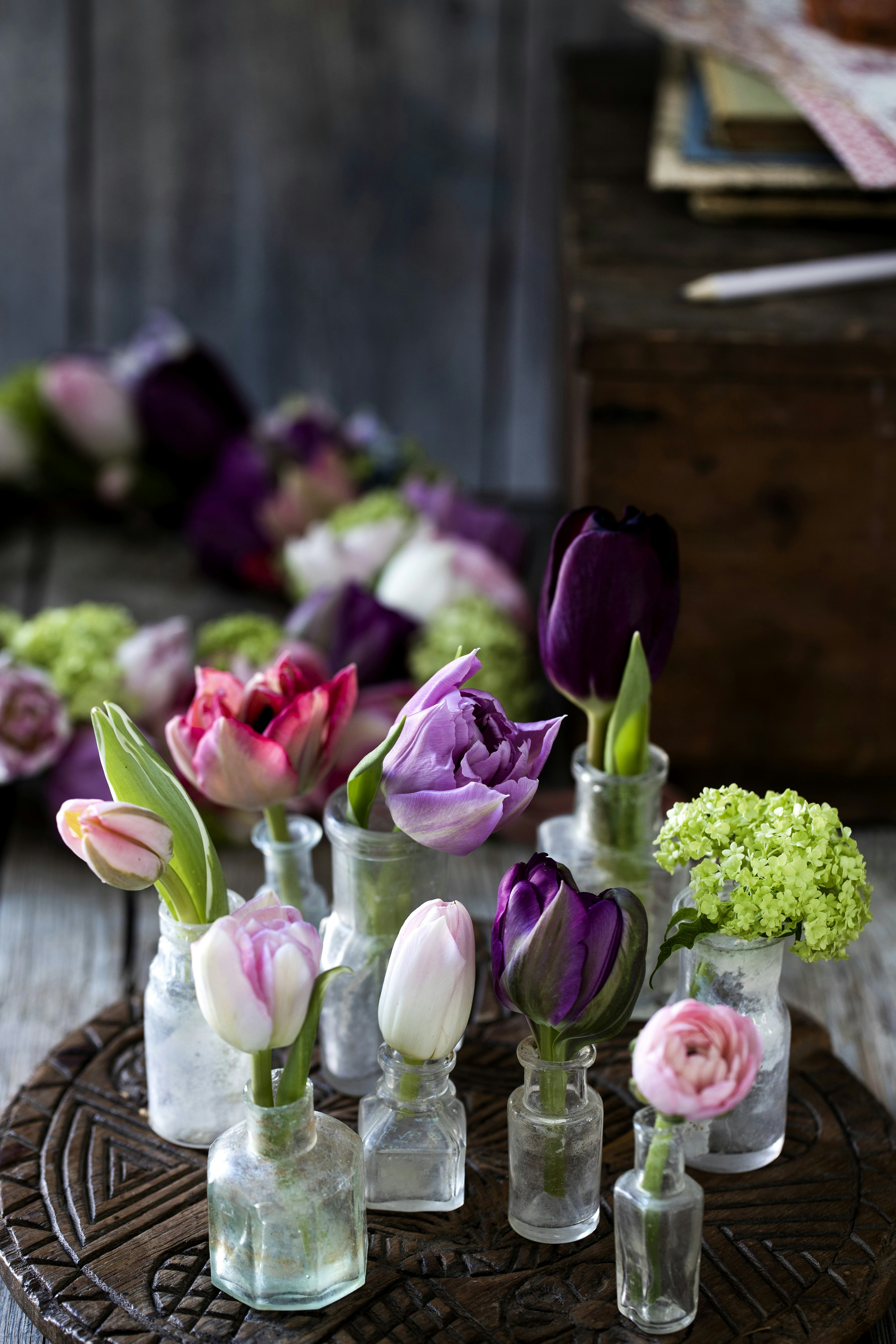 Små, gamle vaser og flasker er perfekte til en enkelt blomst, og det ser flot ud, når du sætter flere sammen på et fad. Supplér evt. tulipanerne med andre blomster eller lidt grønt fra havens buske og træer. Det er en billig måde at få et større blomsterarrangement på.