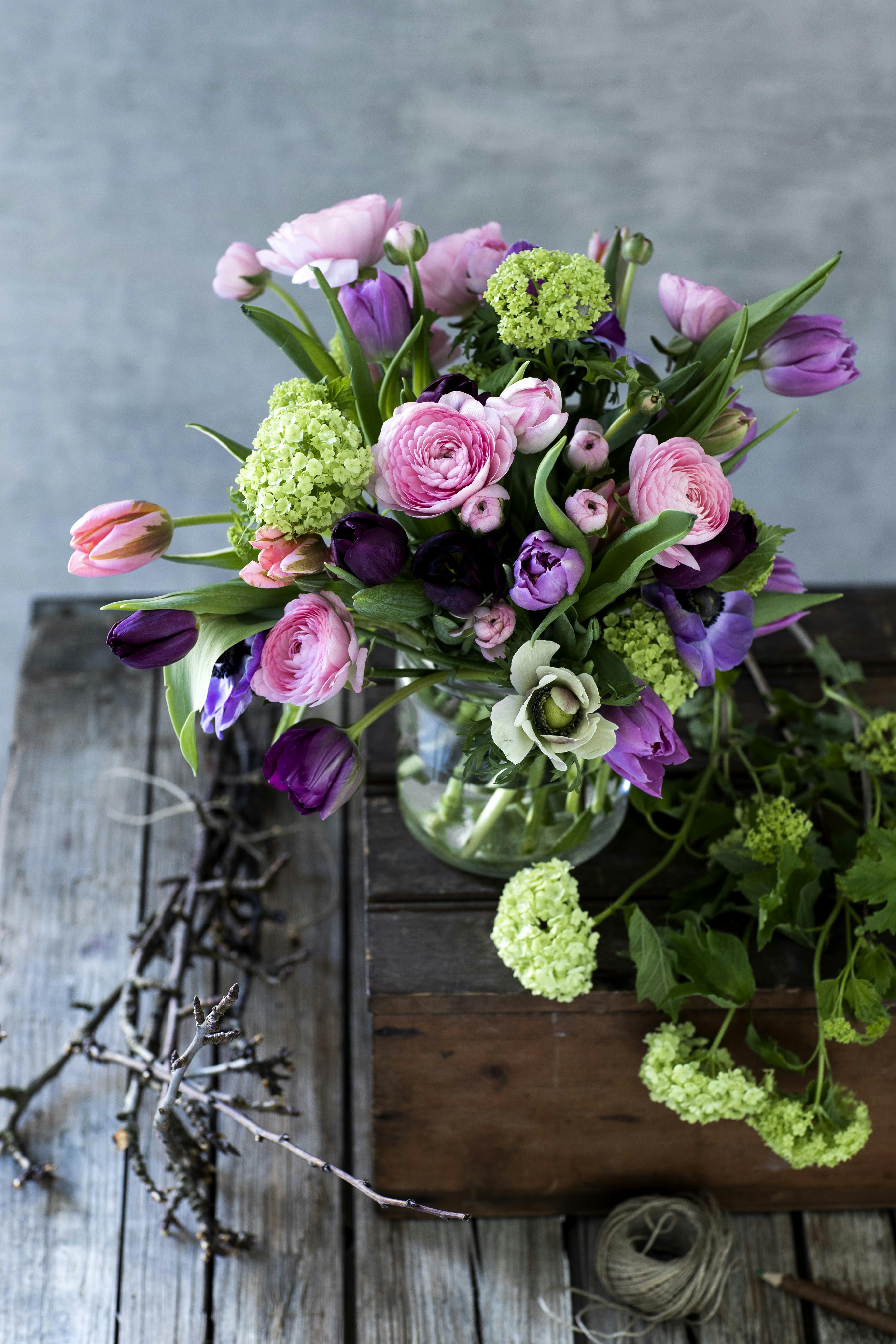 Lilla og lyserøde blomster er smukke sammen, og når du blander dem med den almindelige snebolles limegrønne blomster, bliver udtrykket friskt og forårsagtigt. Udover almindelig snebolle består buketten af tulipaner, ranunkler og franske anemoner.
