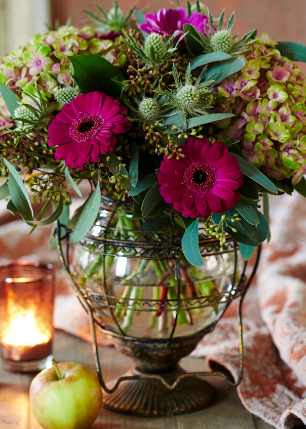 Brug sæsonens flotte pinke og lyserøde farver, og kreer den fineste efterårsbuket. Bind denne stemningsfulde buket med hortensia, gerbere og mandstro, der forener dufte og farver.