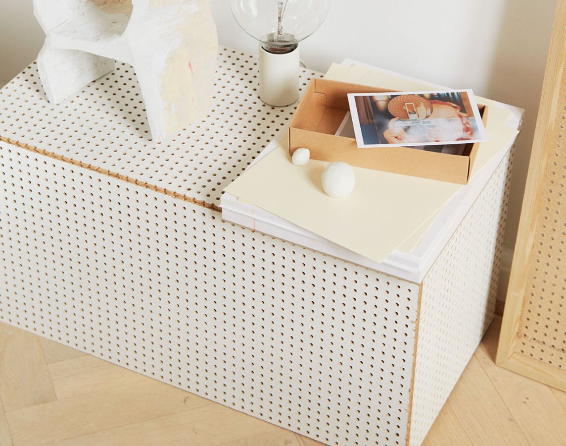 Du kan meget nemt bygge en lille kasse, der bliver lidt mere interessant at se på med de mange små huller i overfladen. Brug den som et lille afsætningsmøbel, sengebord eller som praktisk og dekorativ opbevaringsplads.