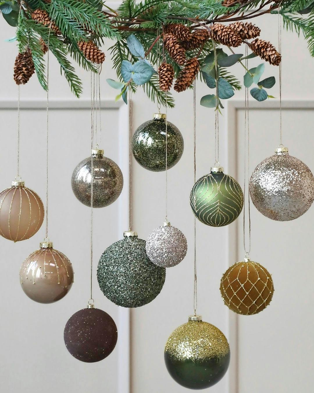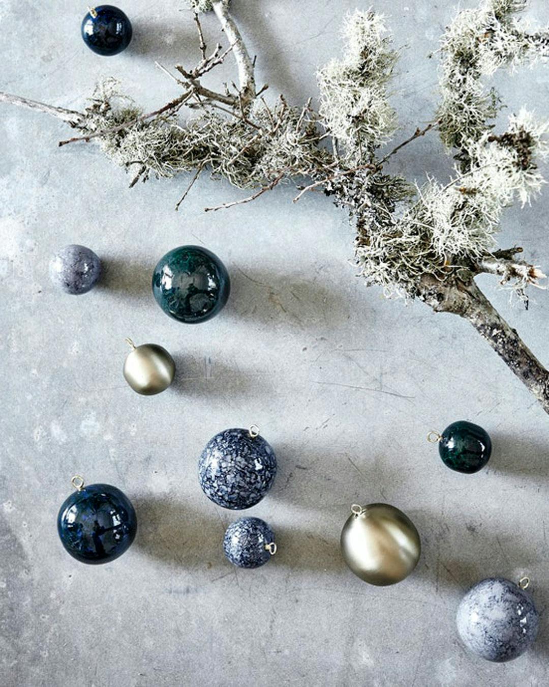 Hæng en masse kugler i forskellige udtryk og størrelser - men i toner, der matcher hinanden - på en gren i stuen for at skabe stor effekt på en nem måde. Julekugler fra Casa Living.