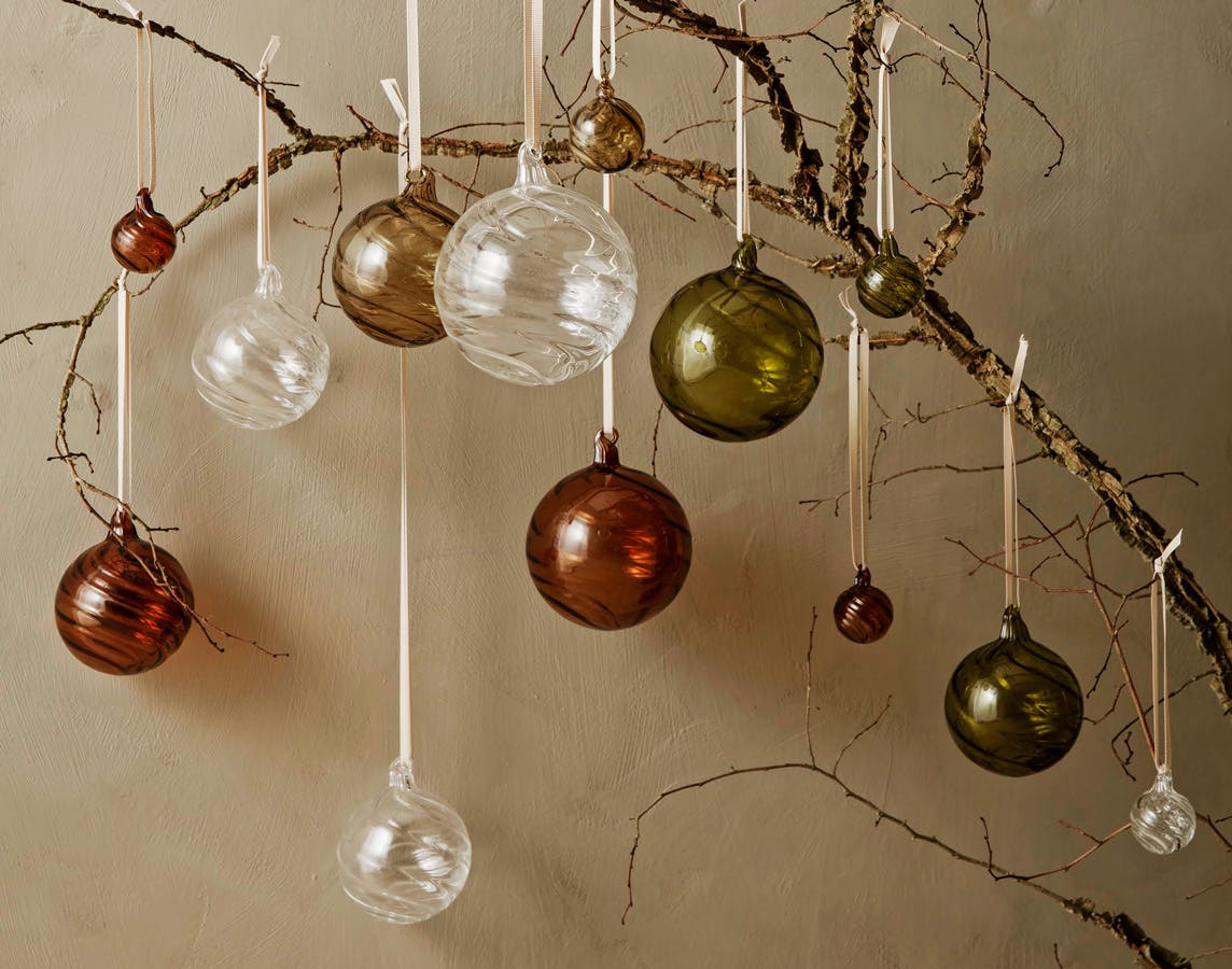Afdæmpede julekugler i glas i forskellige størrelser fra Ferm Living.