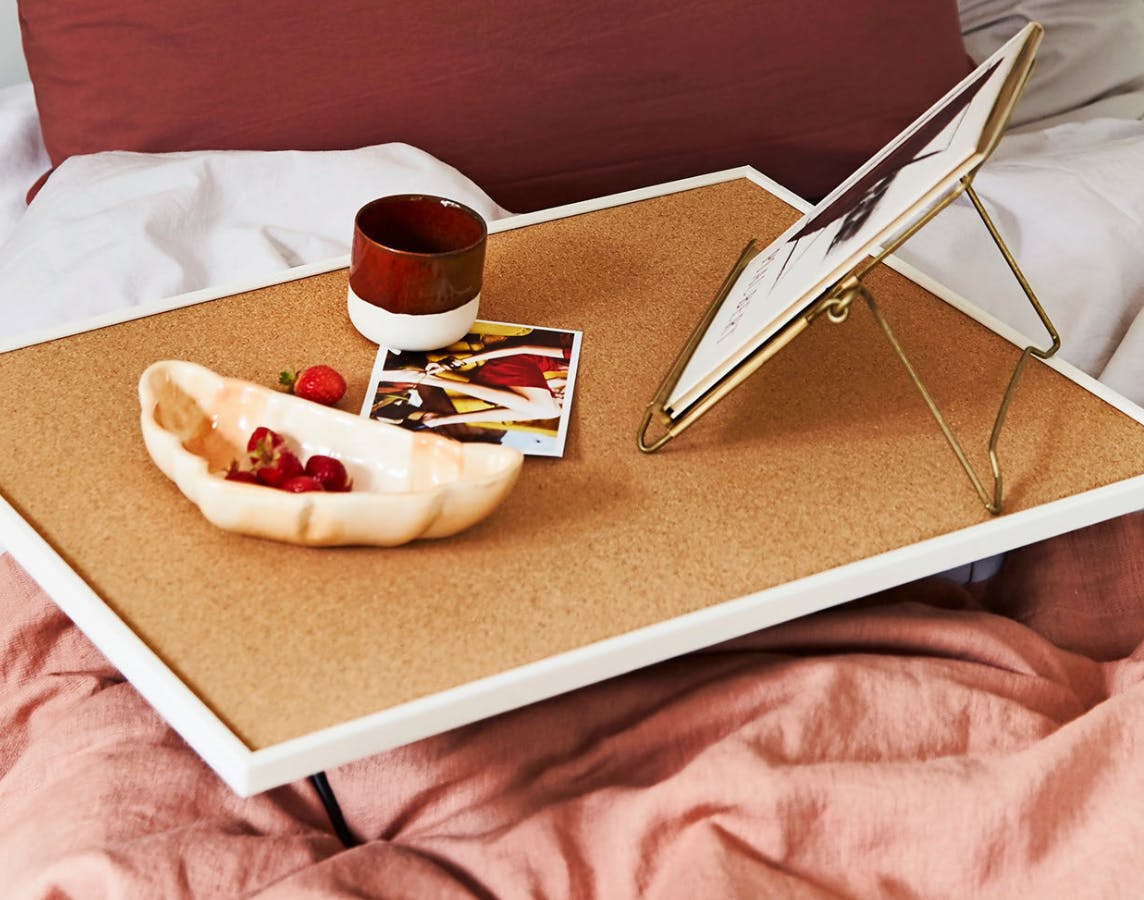 Med få, simple materialer kan du lave dit eget bakkebord, der gør det nemt at sidde i sengen med mad og drikke eller computer og notesblok. Her er pladen lavet af kork, men du kan også bruge andre materialer eller farver, du godt kan lide. Det gode ved kork er, at materialet kan tåle varme, så du kan sagtens stille en varm kande kaffe eller te på bakkebordet.