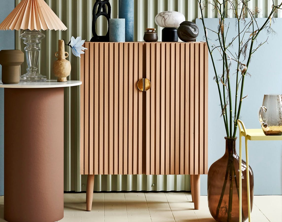 Skabe kan nemt få et nyt, friskt udtryk ved blot at give lågerne et nyt look. Her bruger vi trælister og maling til at give lågerne flot struktur. Få farveinspiration af malerprøverne her: