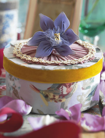 - Lim kartonet fast inde i låget for at skjule nylon og trådender. Lim et sløjfebånd rundt i kanten, hvor nylonet slutter på låget som fin afslutning.