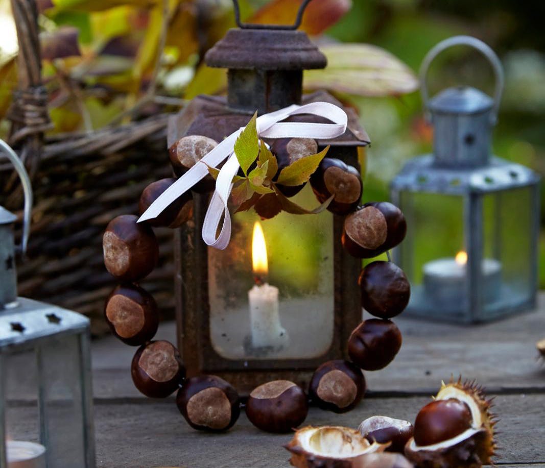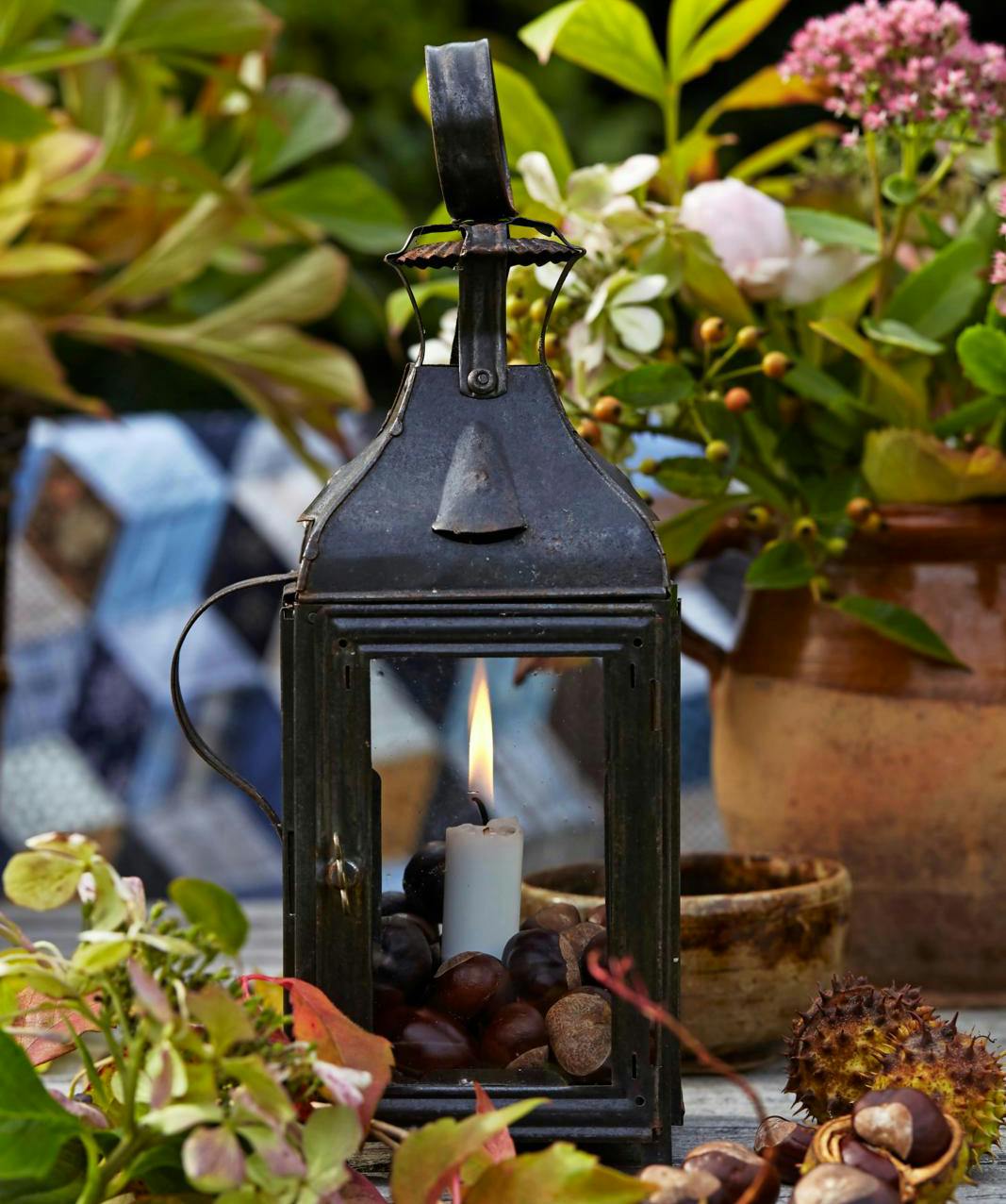 Gamle lanterner er smukke i sig selv, men det skader ikke at pynte dem lidt, så de passer til årstiden. Denne har fået en bund af kastanjer, der signalerer efterårshygge. Til jul kan de skiftes ud med f.eks. lærkekoogler, små, røde æbler eller minijulekugler. I stedet for et stearinlys kan du komme en lyskæde i lanternen.