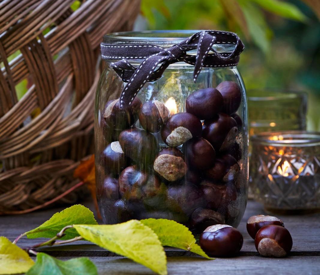 Fyld et stort sylteglas eller en stor glasvase halvt op med kastanjer. Sæt et lille fyrfadsglas med et fyrfadslys i ned oven på kastanjerne. Læg lidt ekstra kastanjer rundt langs siden, så fyrfadslysestagen stabiliseres. Bind et bånd om syltetøjsglassets top, og tænd lyset.
