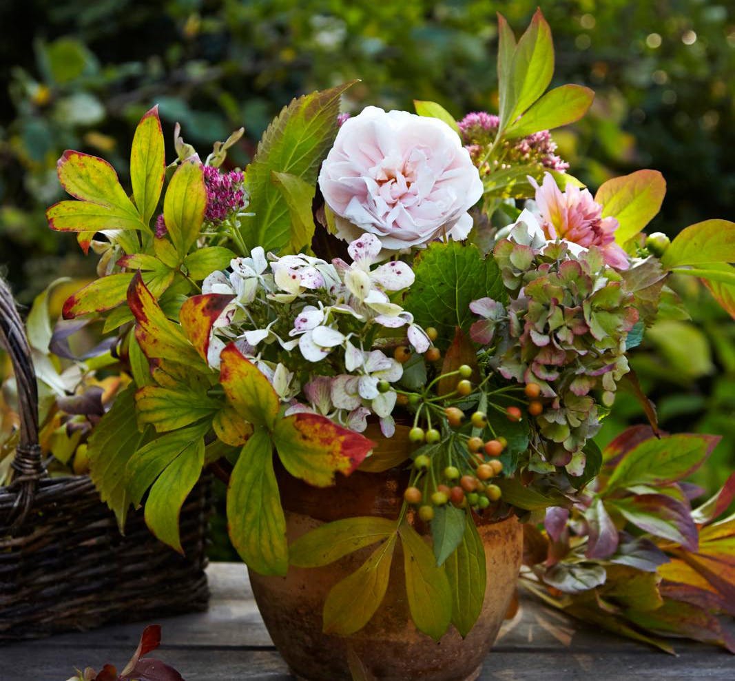 Selvom mange blomster i haven er afblomstret, kan det betale sig at gå en runde og se efter, om der skulle være enkelte blomster tilbage. Bland blomsterne med smukke gyldne grene, blade og hyben fra rosenbusken. Buketten her består af forskellige hortensiaer, sankthansurt, dahlia, hybengrene, en enkelt rose og gyldne pæonblade.