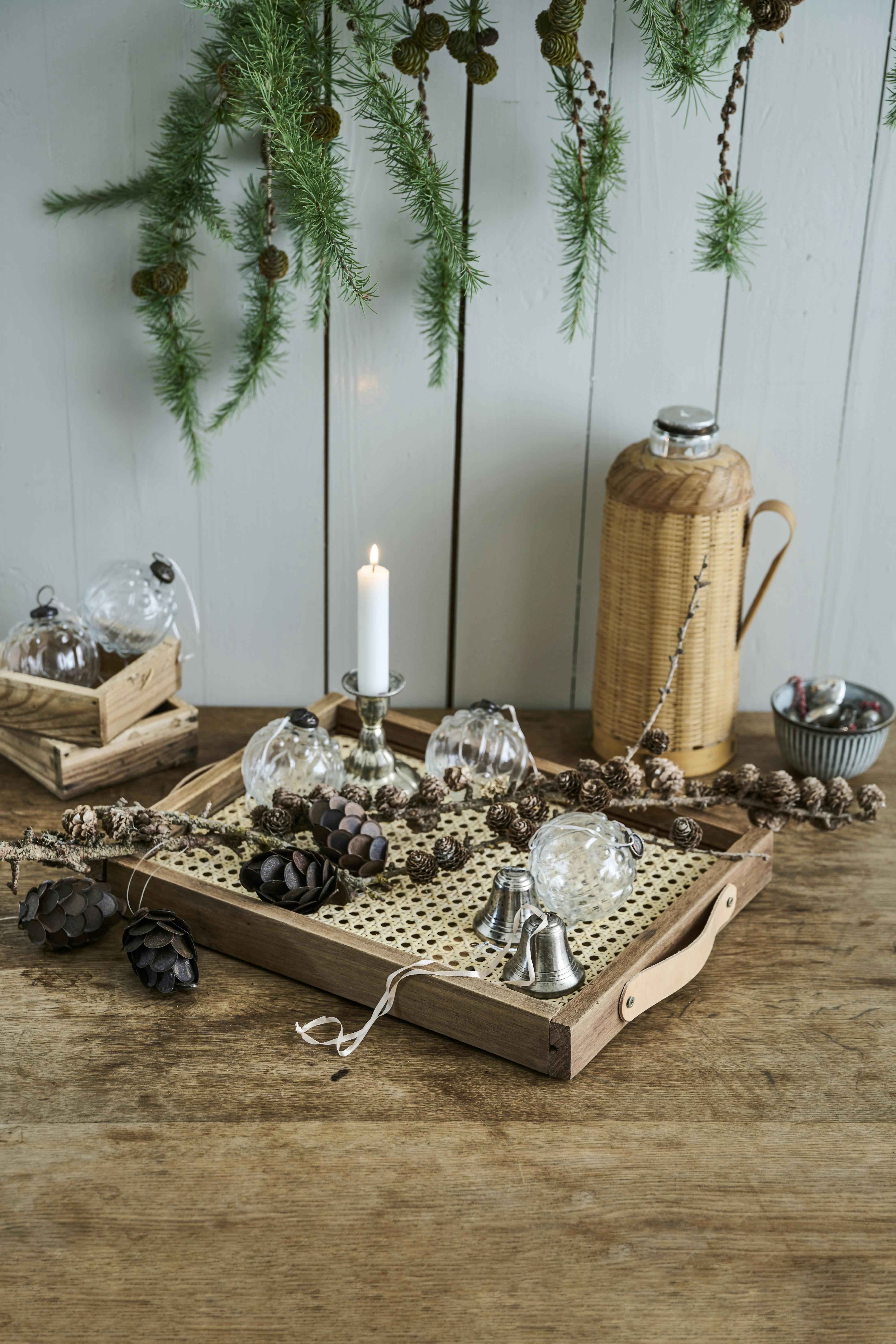 Her har vi brugt de simple materialer til en fin bakke, der især passer godt til en fin juledekoration. Den smarte bakke kan dog nemt bruges året rundt til praktiske og dekorative formål.