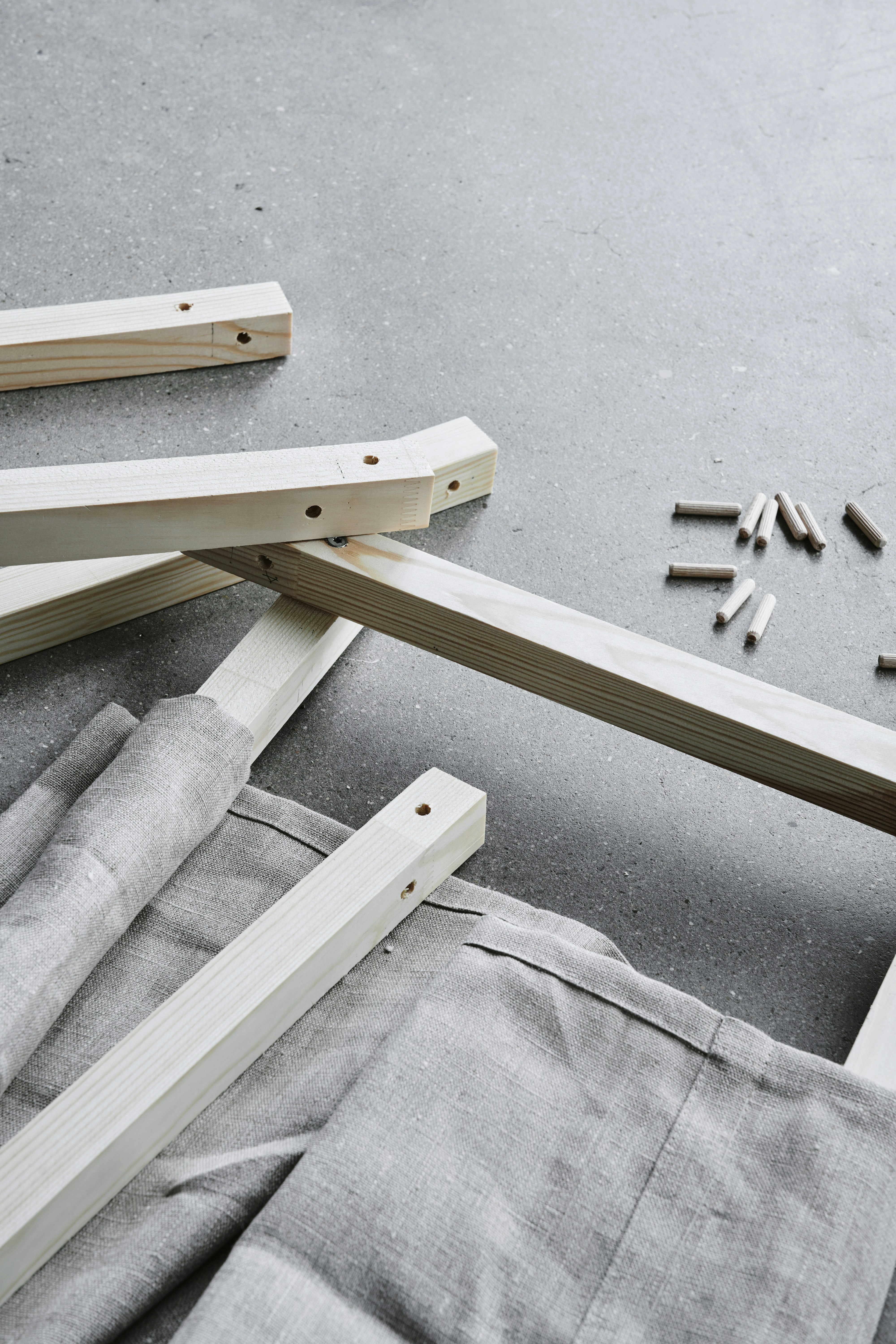 TRIN 3: Før nu de 2 lange lægter igennem enderne på stoffet. Placér 2 kortere lægter på tværs af de lange, så der stikker 4 cm ud over kanten i begge sider, og 2,5 cm i enderne. Skru dem sammen. Lav bakken ved at placere de 2 smalle endestykker på undersiden af bakken. Midterstykket lægges præcist i midten af det resterende rum på undersiden. Lim stykkerne sammen, og læg dem i pres i ca. 1 time.