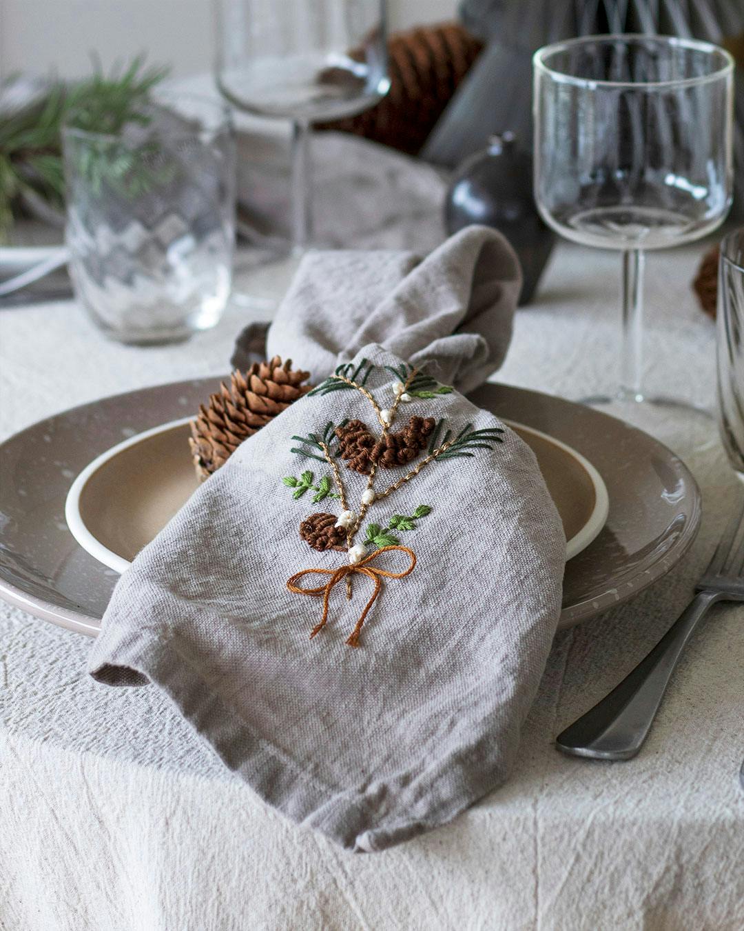 Når grangrenen er færdig, er det tid til at brodere grankogler med mørkebrunt garn. Stik nålen igennem servietten fra bagsiden, og sy koglerne med franske knuder. Det vil sige, at du snor garnet ca. 10 gange rundt om nålen, før du stikker nålen igennem stoffet igen et lille stykke ved siden af, hvor den kom op. Sådan bliver du ved, indtil du har formet en kogle.