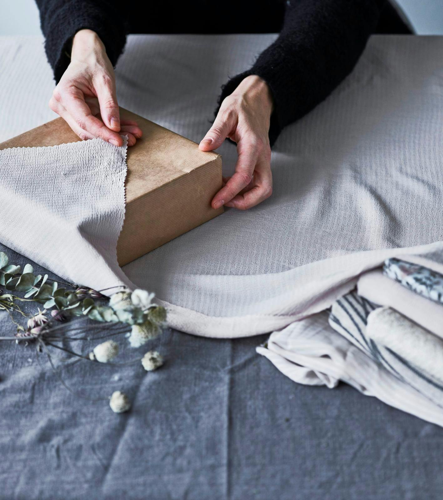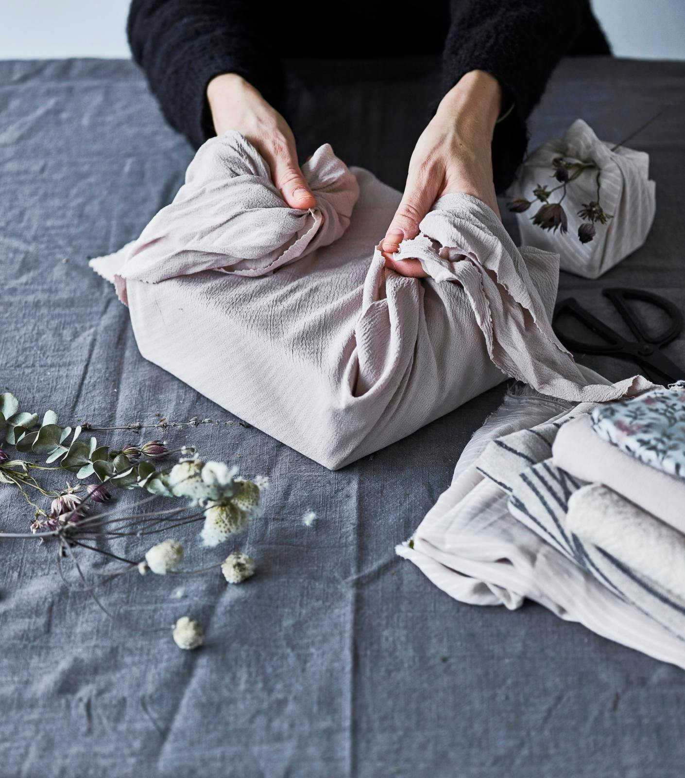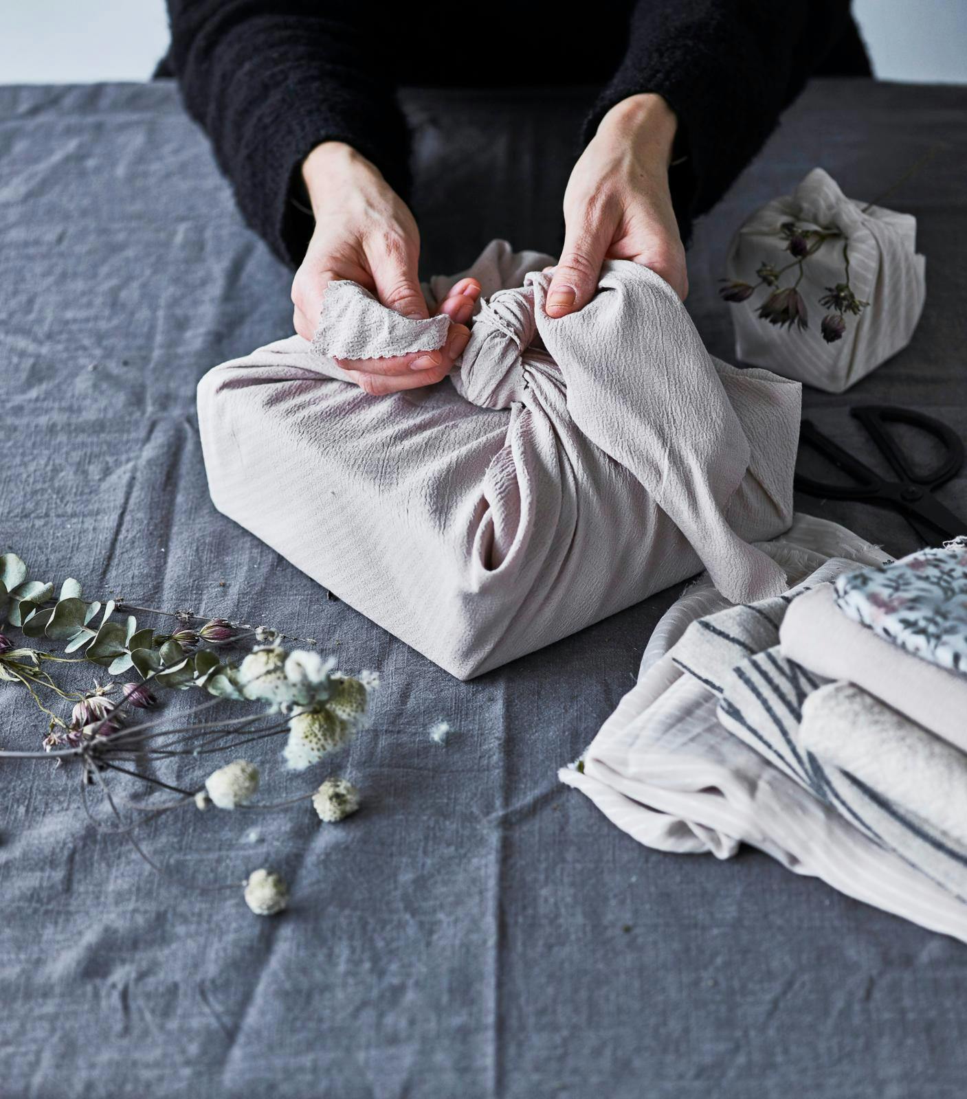 De er gode til indpakning og kan bruges til gaver i forskellige størrelser. Gør brug af den japanske gaveindpakningsteknik furoshiki, og dekorér din gave med sæsonens naturpynt fx. med fine blomster til en fødselsdag eller gran og kogler i juletiden.