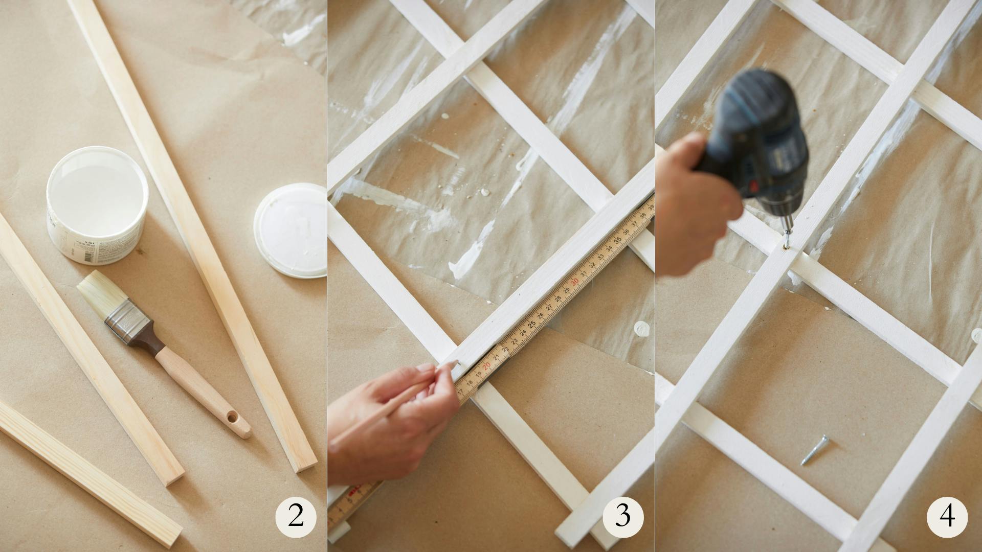Trin 4: Skru listerne sammen. Du kan evt. markere samlingspunkterne med blyant inden. Mal evt. dit stativ igen, inden du monterer det på muren.