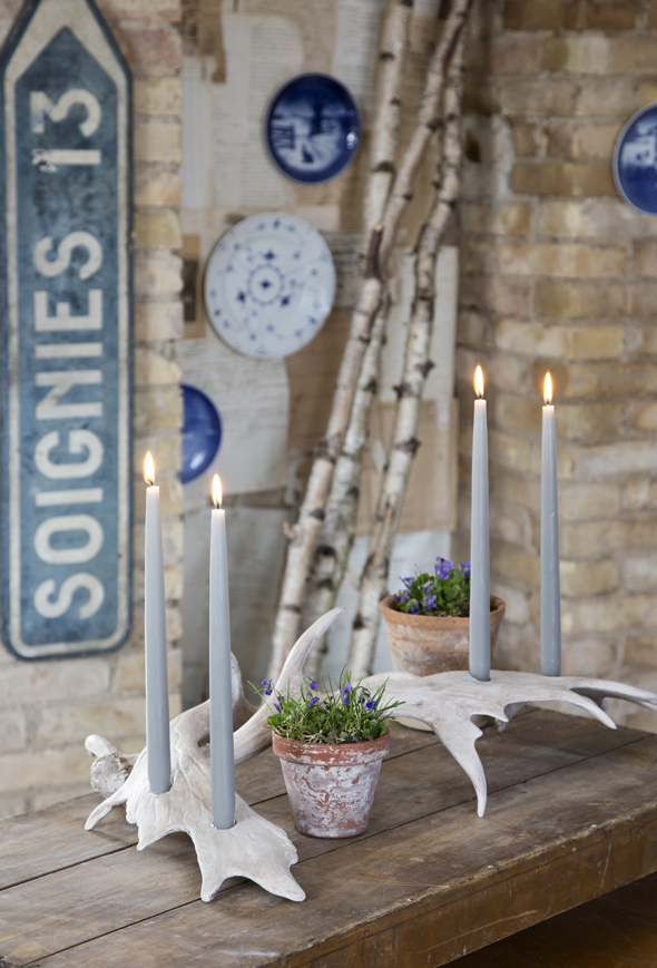 Et gevir med lys i, der slynger sig hen ad bordet, giver et flot nordisk look i stuen. Borer du huller til fire lys, kan du bruge geviret som adventsdekoration til næste år.