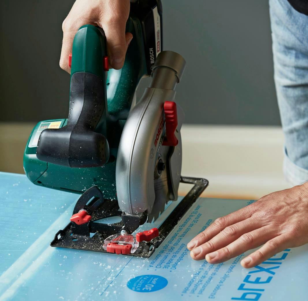 Trin 1: Skær 2 stykker plexiglas til – vores største ramme måler 50 x 38 cm – med rundsaven. Sav langsomt, og indstil klingen, så den kun lige akkurat går gennem plexiglasset.
