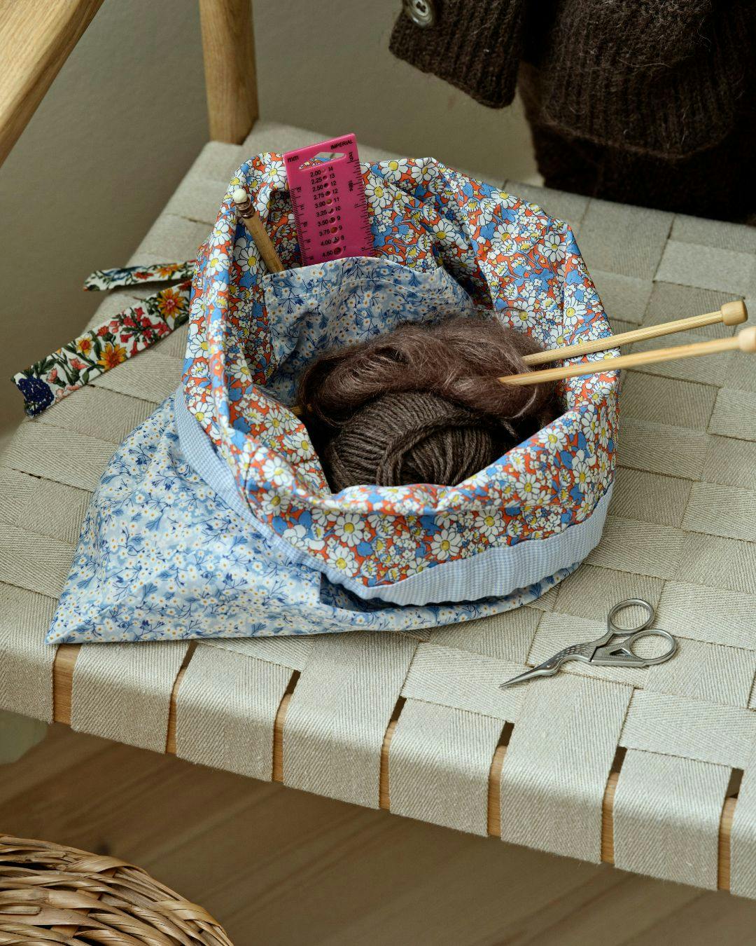 Har du farverige og blomstrede stofrester liggende, kan du give dem nyt liv og på samme tid få et sted at opbevare dit strikketøj.