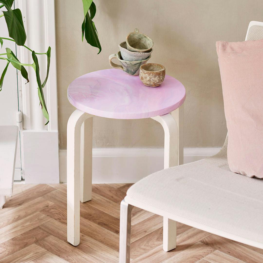 Her har vi givet en simpel træskammel en makeover med en lyserød marmoreret overflade. Du kan også sagtens bruge andre møbler og farver. Følg den simple guide herunder.