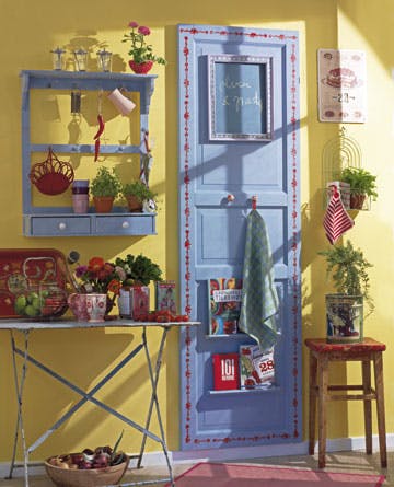 Mal døren med grundmaling, og lad den tørre. Mal så døren i to omgange med den blå maling, lad den tørre mellem hvert lag. Læg døren ned, lim bræddehylderne på, og lad det tørre. Hæld en lille klat rød hobbylak op på en tallerken. Placer stencilen foroven på døren ved at sætte den fast med små stykker malertape.