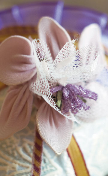 2. Klip stykker af nylonstrømpen på ca. 6 x 4 cm. Læg nylonstykkerne hen over de blomsterformede lykker og de snoede samlinger, så de bliver pakket ind i nylon.