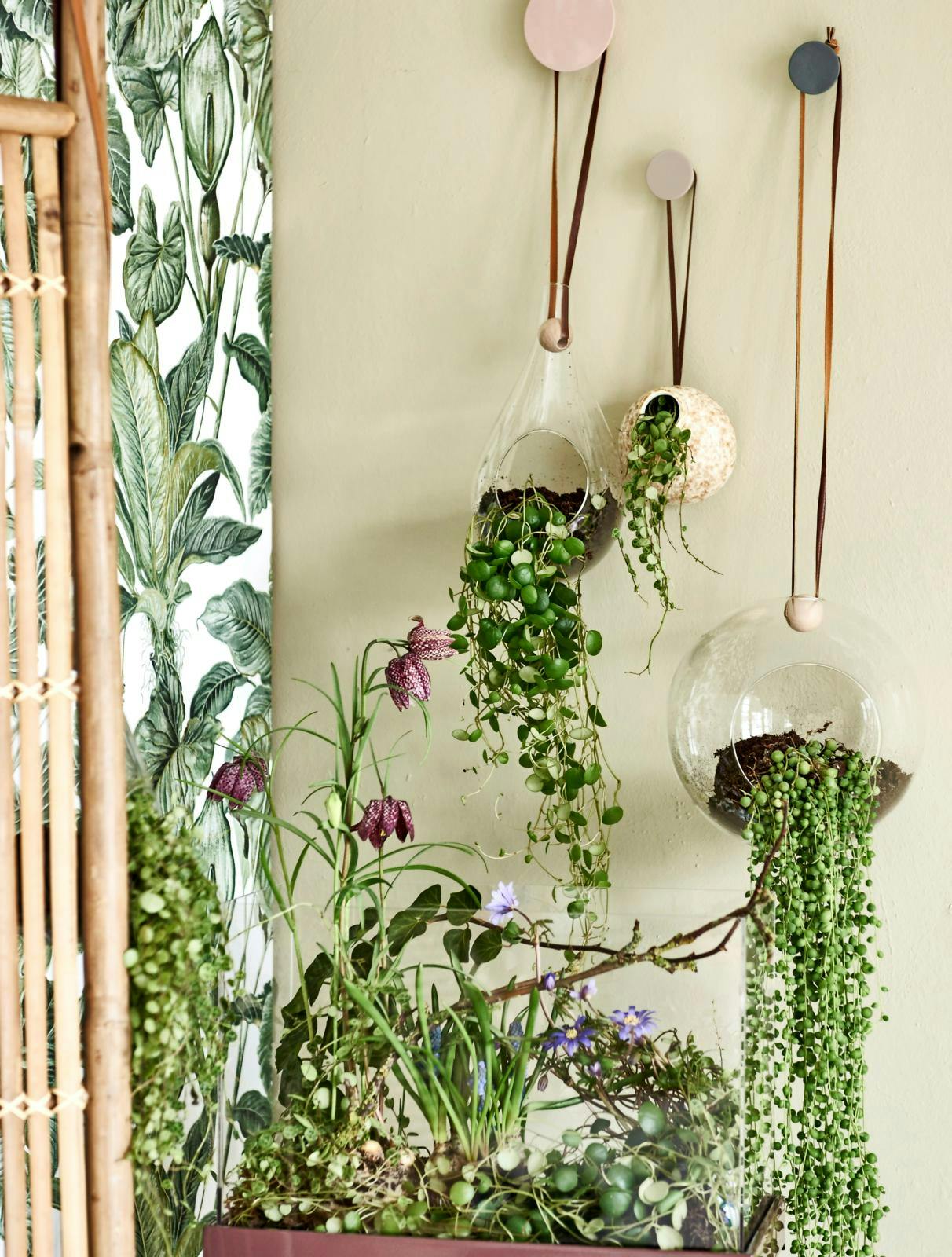 På badeværelset er det fint med en plantekasse af glas og nogle hængeplanter på væggen. Lav en smart ophængsløsning med knager og lædersnor, og placér de grønne planter i åbne glaskupler. Det er både pladsbesparende og giver liv til de ellers ofte bare badeværelsesvægge.