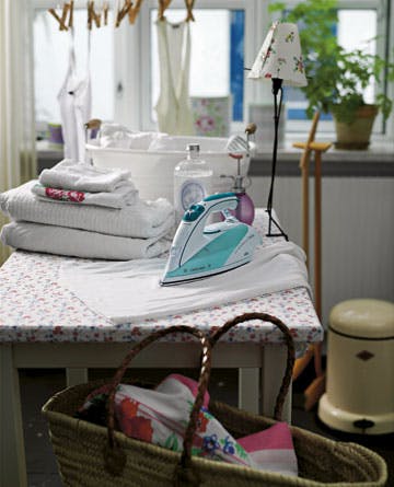 Lav dit eget strygebord ved at klipse strygefilt om en bordplade med hæftepistol og derefter betrække bordpladen med dit yndlingsbomuldsstof. Strygefilt 129 kr. per meter. (Stof 2000).