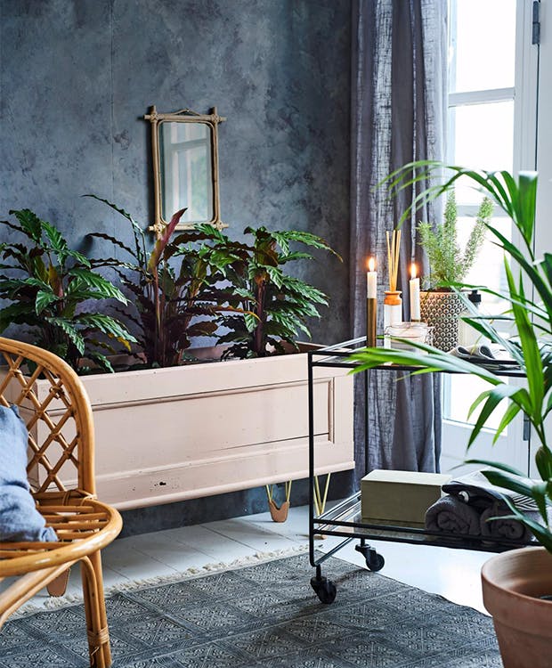 Lad plantekassen indgå som et personligt element i din indretning. Vi har kreeret en fin rosa plantekasse og fyldt den med ens planter (her: Rødskæg, Calathea), der giver et roligt og skønt udtryk!