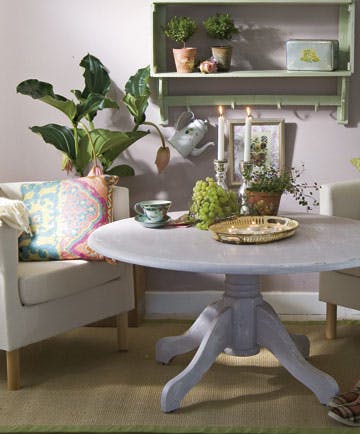 Trin 4: Nu skal du genbruge de fire oprindelige skruer. I hvert hjørne af den lille plade er et hul. Skru nu de gamle skruer op i undersiden af selve bordpladen. Stram dem til, og bordet er samlet igen. Vask bordet af i grundrens, og slib det med sandpapir. Mal med mellemmaling, lad det tørre, og mal igen. Mal nu én gang med den grå maling. Lad det tørre efter anvisning på dåsen.