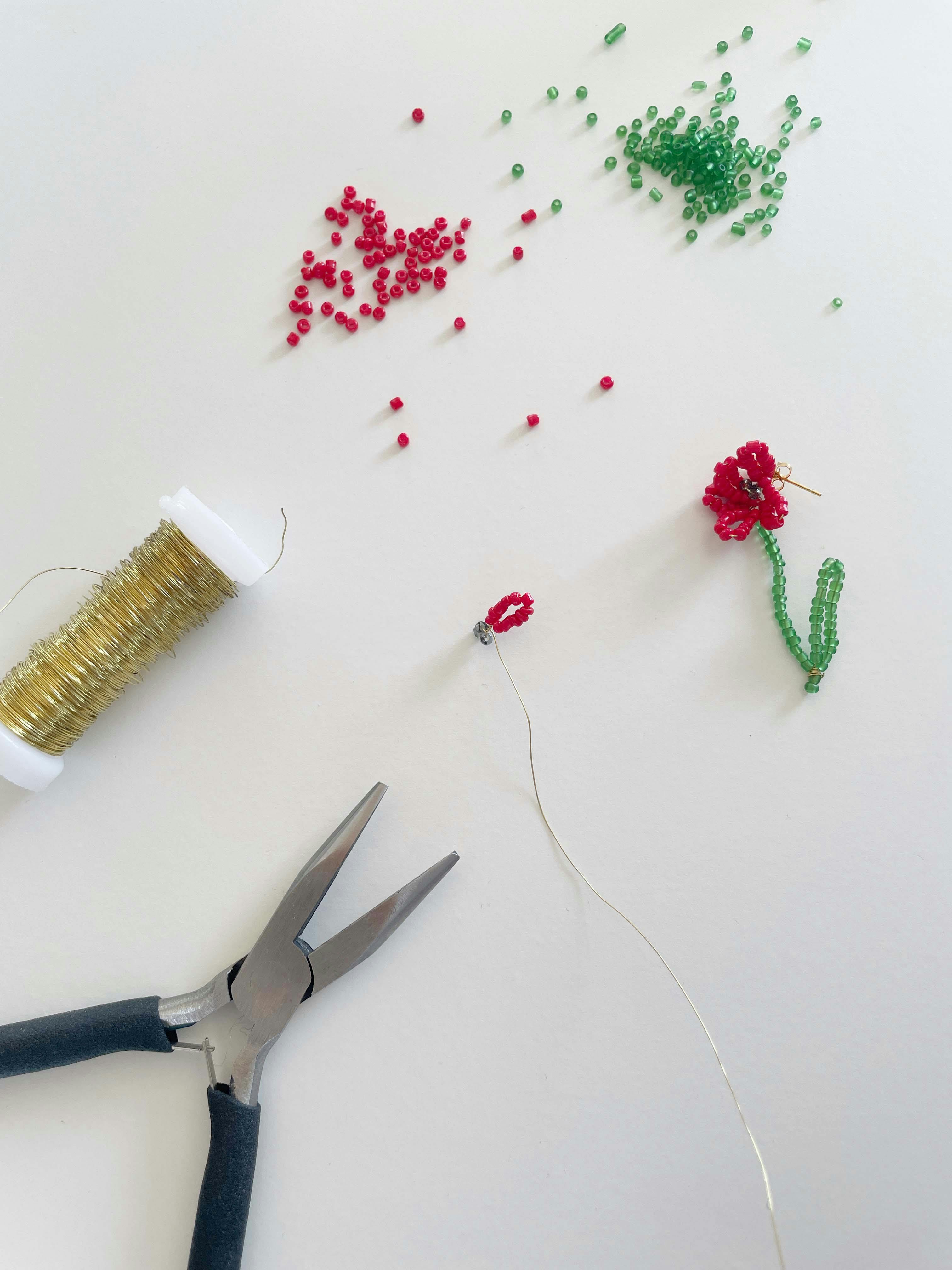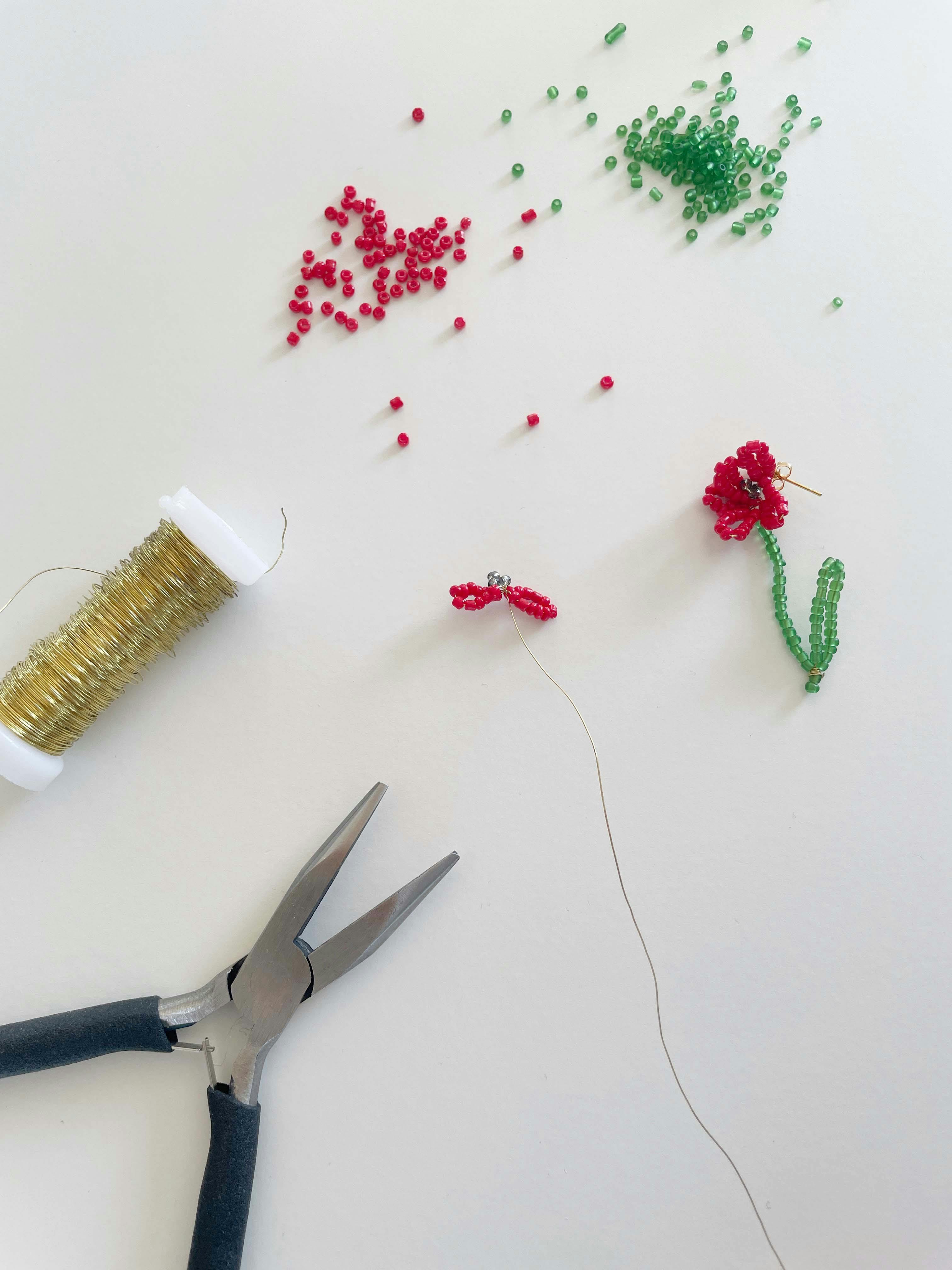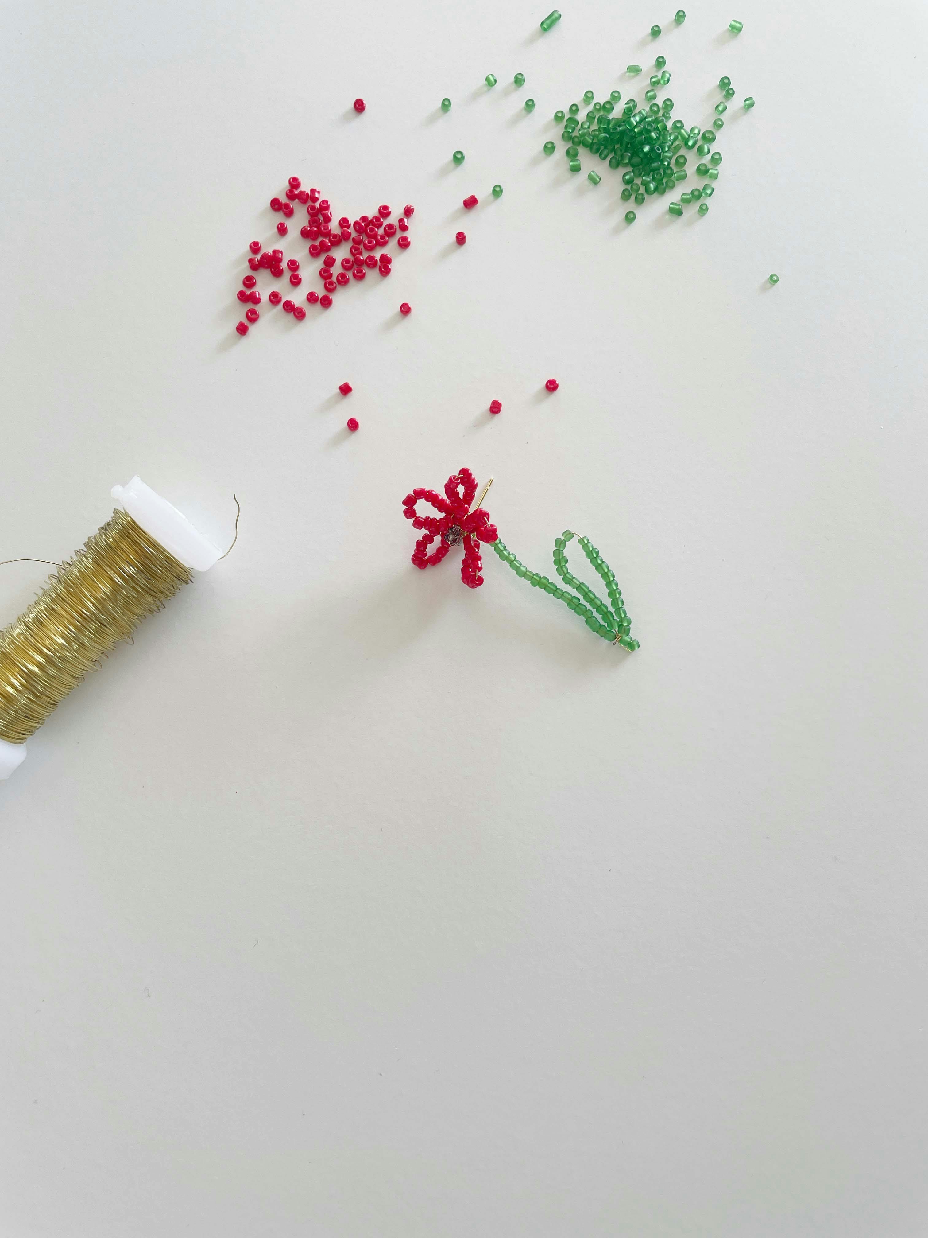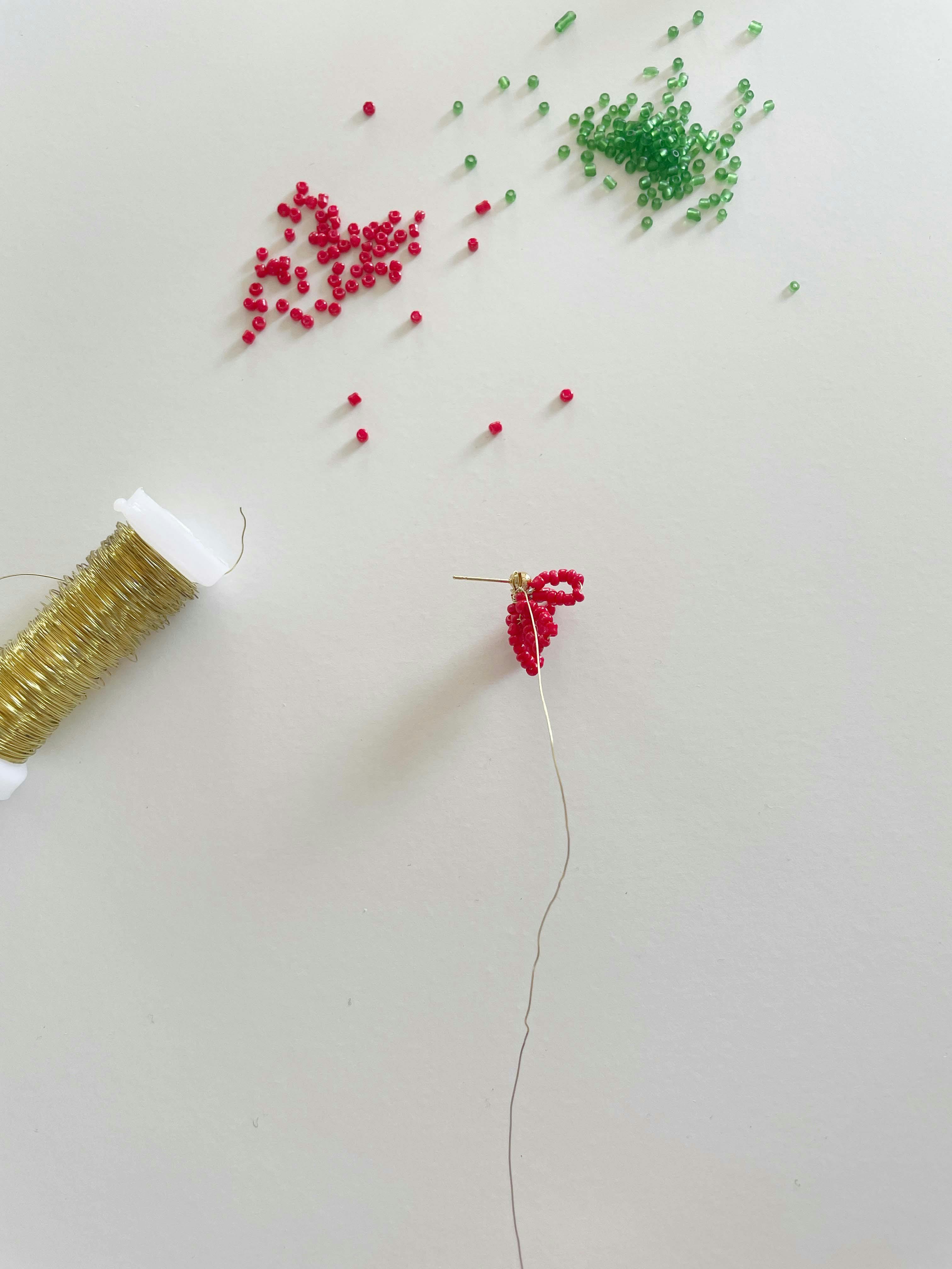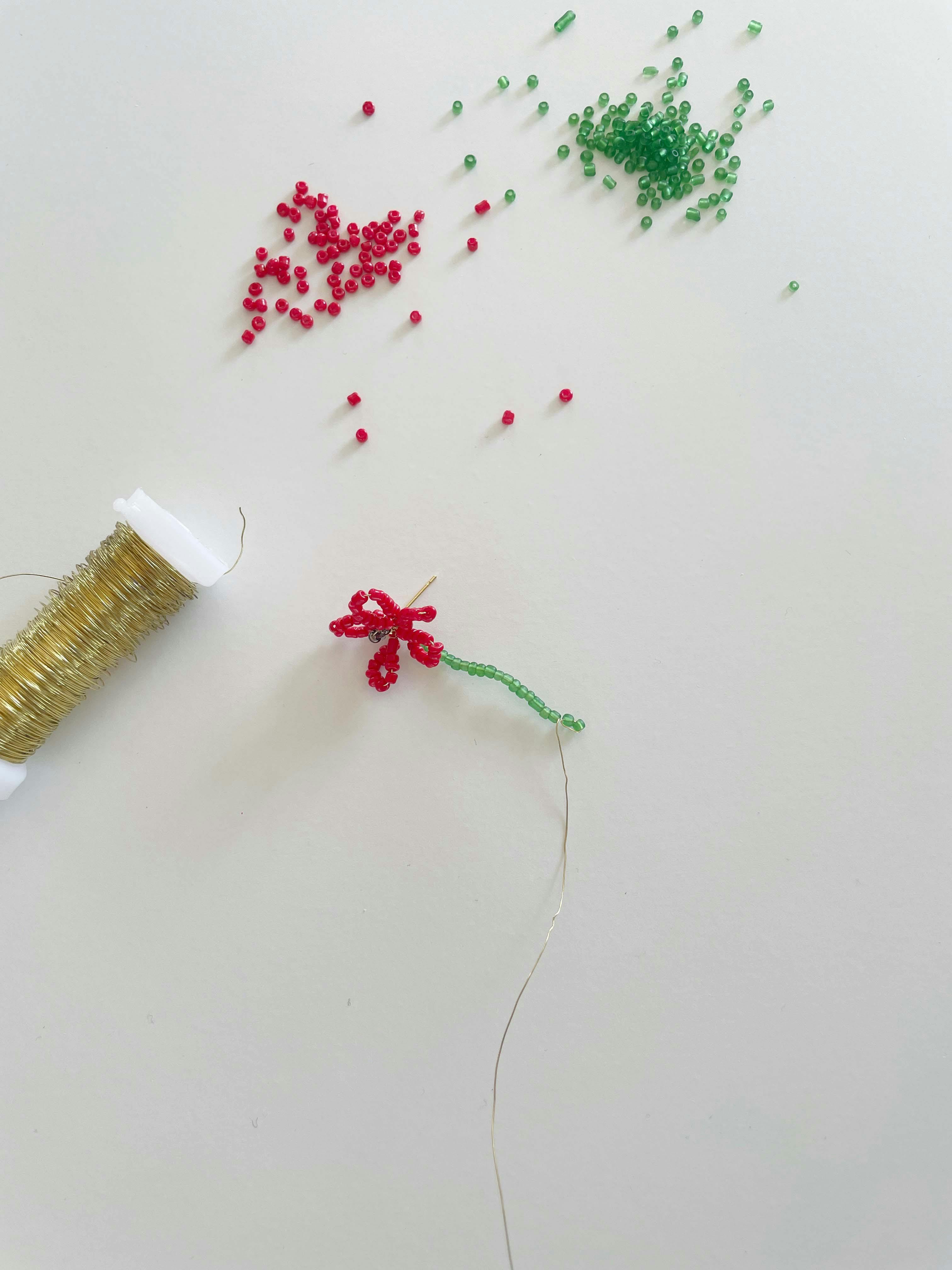 Trin 2: Før 11 røde perler på ståltråden, fold i 1 bue, og hæft rundt om stilken.