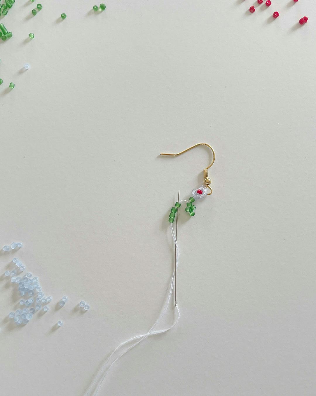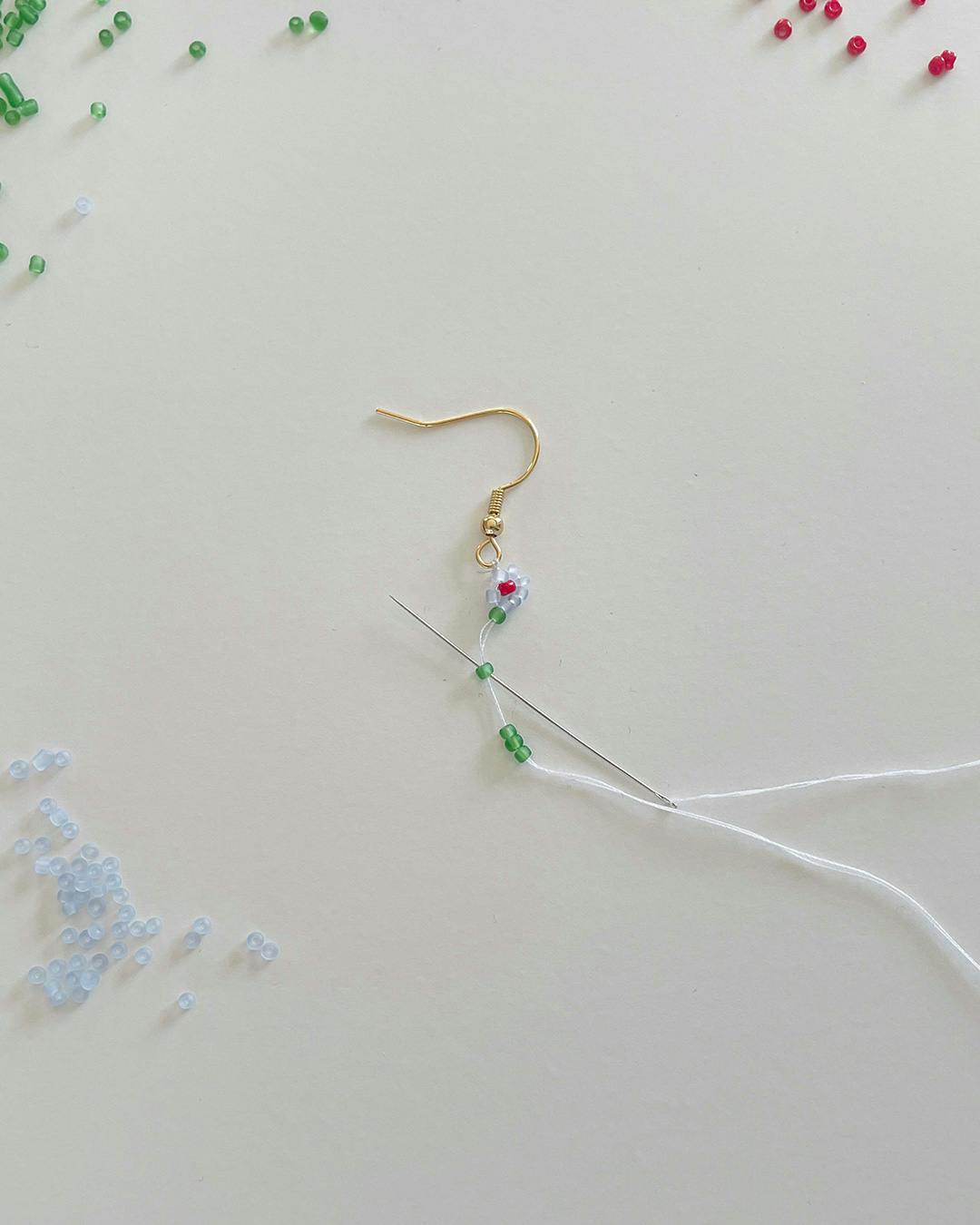 Trin 6: Sæt 3 perler på snoren, som nu danner stilken.