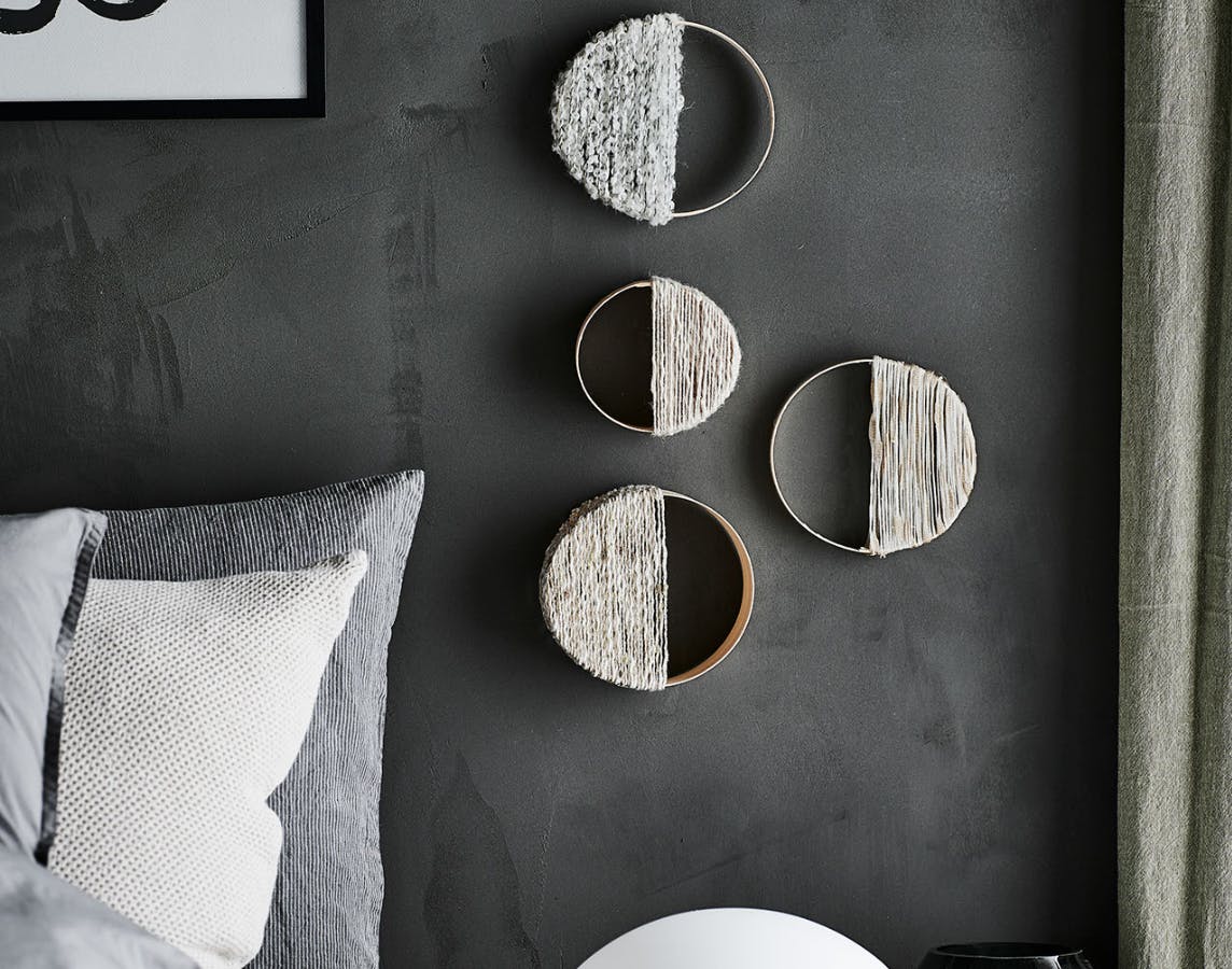 Lav gerne flere halvmåner og hæng dem op som et samlet stykke vægkunst. Her kan du med fordel bruge cirkelrammer i forskellige størrelser og dybder for at skabe dynamik og spil.
