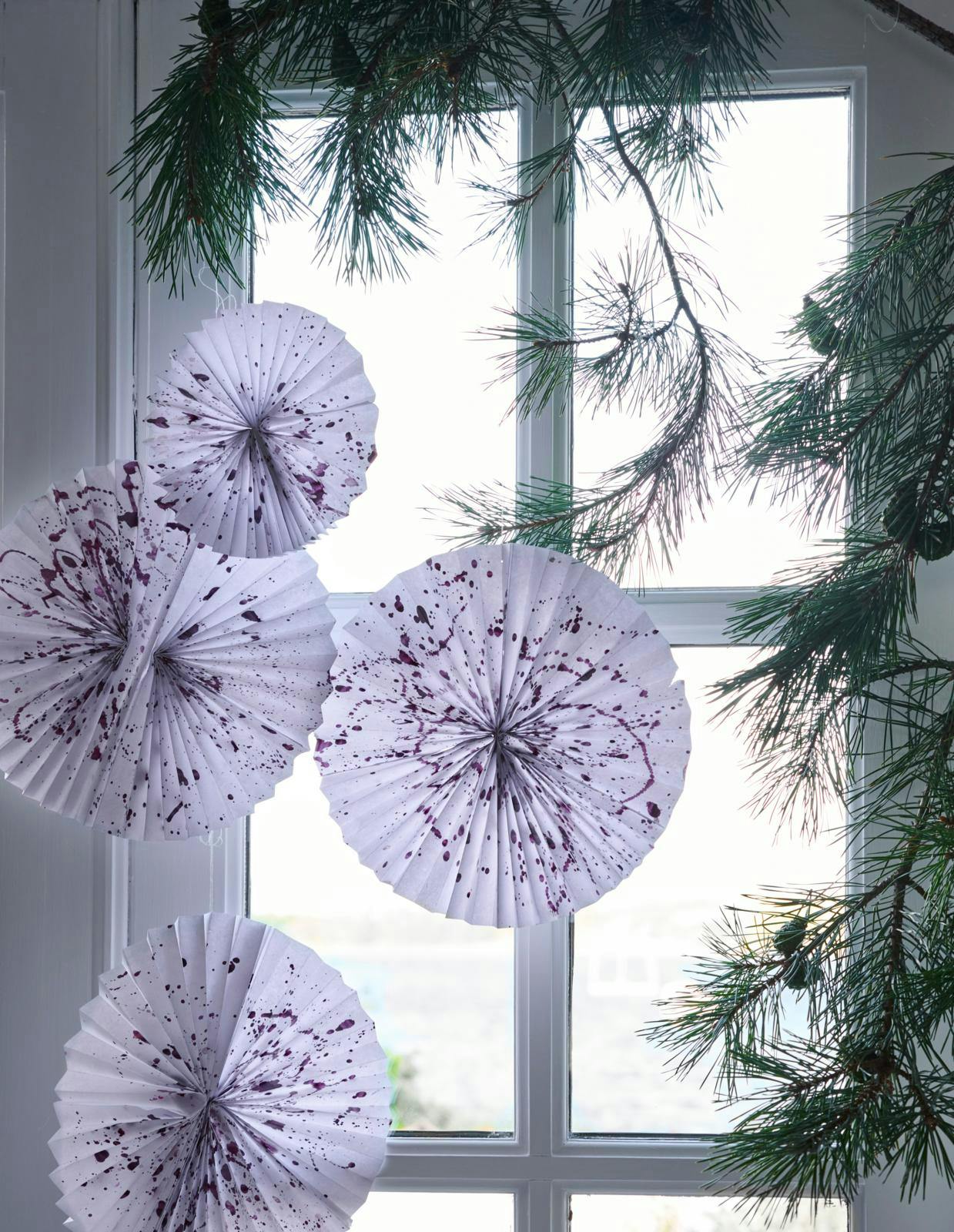 De fleste af os har masser af papir liggende, så brug det til at lave smukke vifter. Sprøjt papiret med brunrød vandfarve, og lad tørre. Fold papiret på midten på den lange led, og fold ud igen. Fold 2 cm’s folder fra den korte side og op. Fold viften på midten, og lim sammen. Gentag med et nyt papir, lim de to halve vifter sammen, og hæng viften op i vinduet.